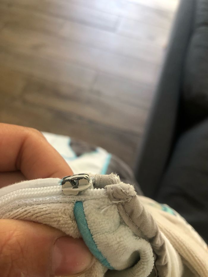 Vend gigoteuse Sauthon « Lazare & Oscar » Bout de la fermeture cassée (voir photo). N’empêche pas de fermer, mais peu parfois glisser un peu quand bébé est dedans. 3 -18 mois, la taille peu s’ajuster avec les pressions.