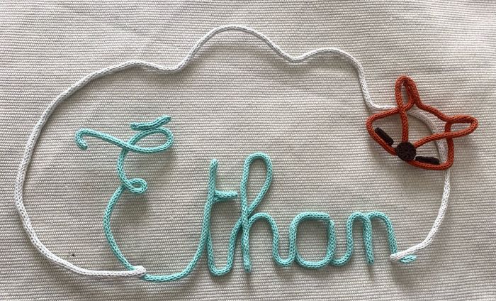 Prénom Ethan en tricotin avec nuage et tête de renard
