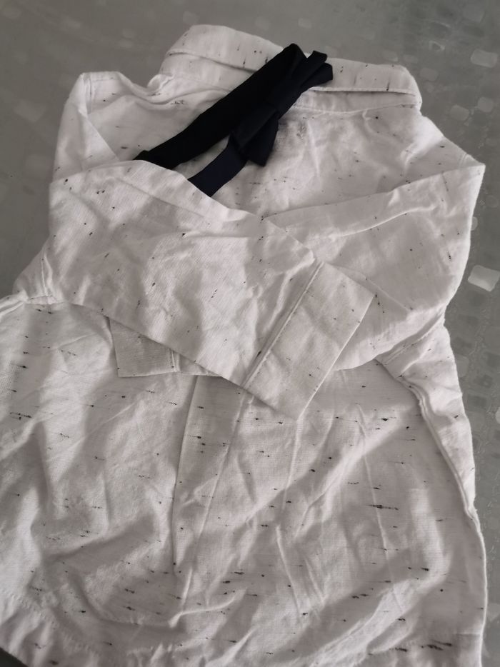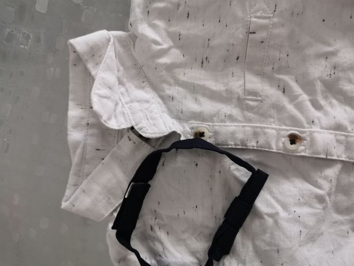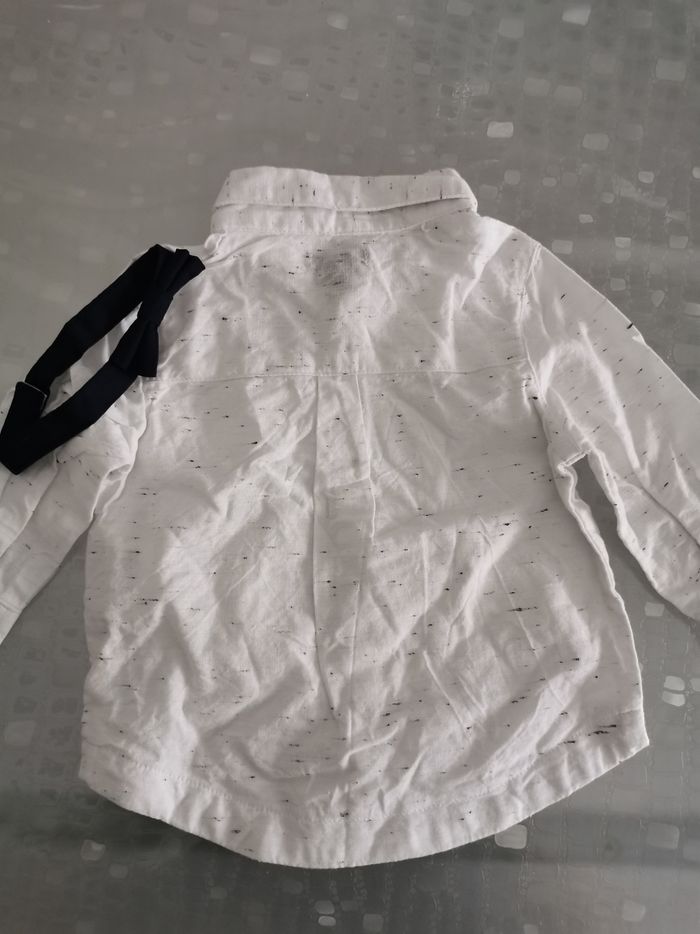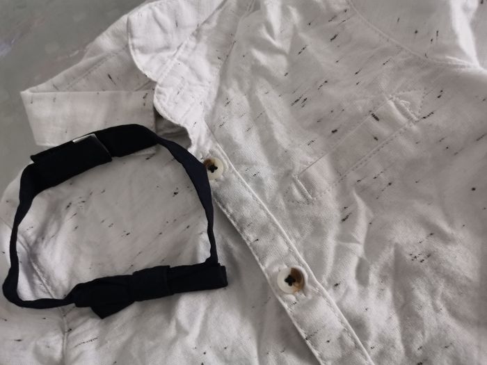 Chemise bébé blanc chiné, avec noeud papillon marine Très bon état 6mois, 63-69cm Kiabi
