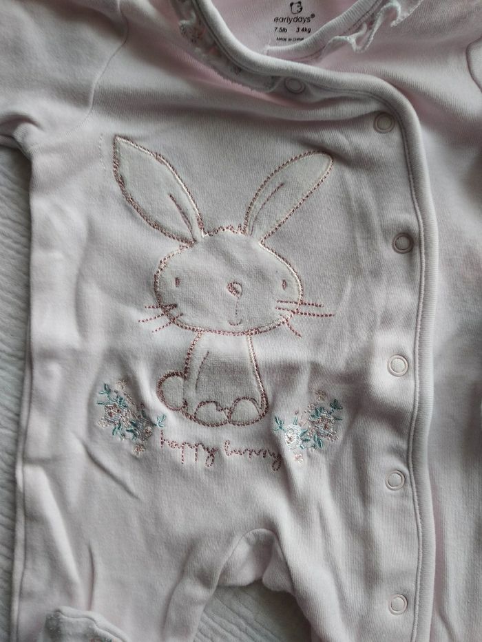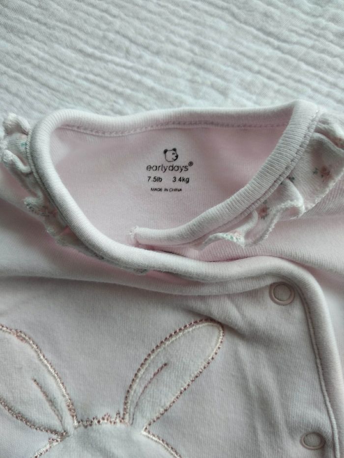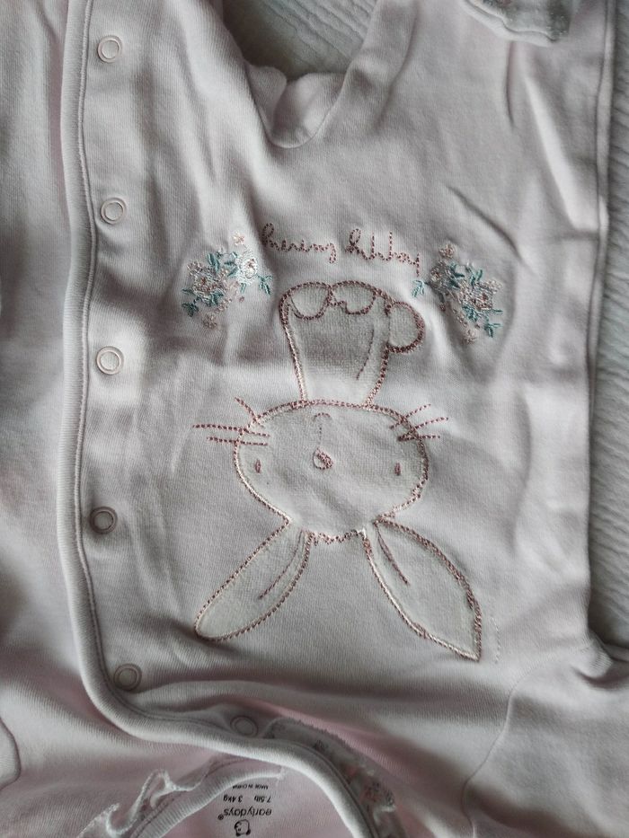 Pyjama 1 mois et ses 2 bonnets assortis Rose pâle Motif lapin et broderies fleurs Ouverture devant Marque early days