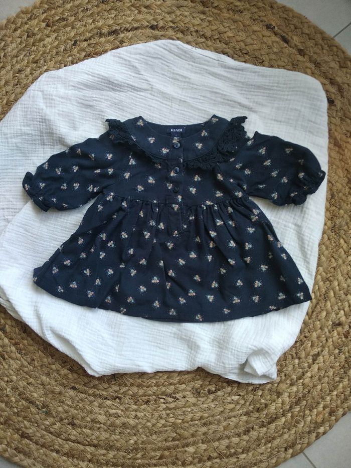 Robe 1 mois Fille Bleu marine et motif de fleurs Col avec broderies Très peu portée Demi saison ou hiver