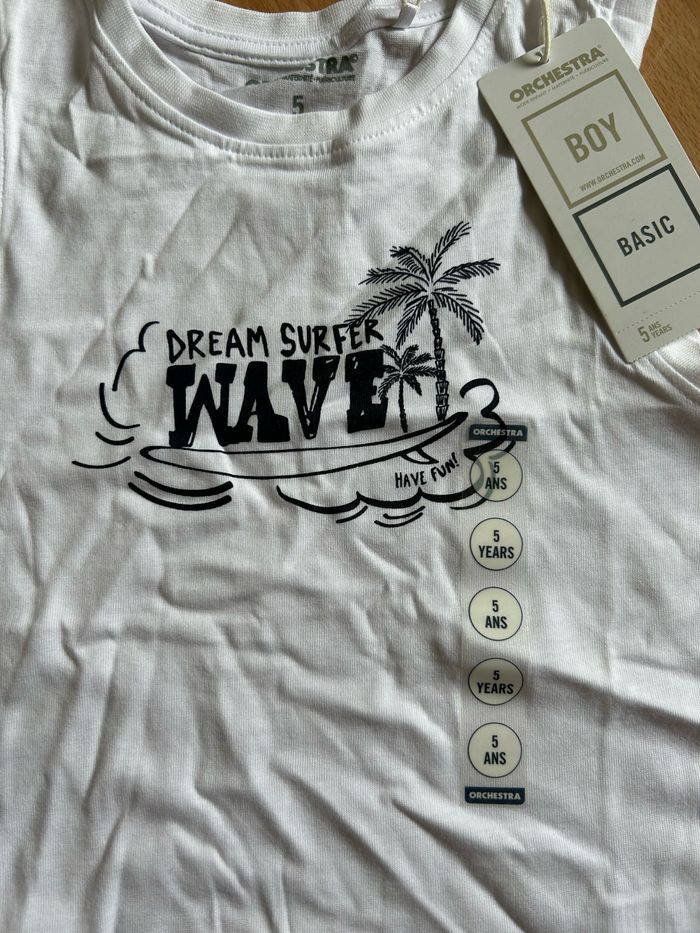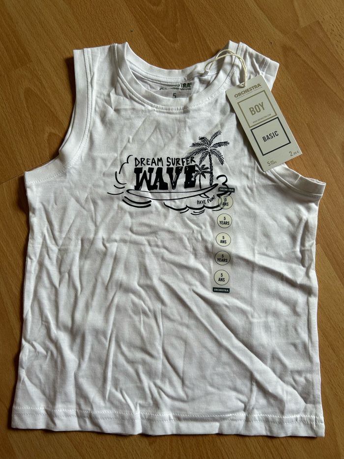 Beau débardeur blanc Orchestra pour garçon ou fille T. 5 ans/110 cm, en coton, neuf avec étiquette. Prix: 2,99 euros.