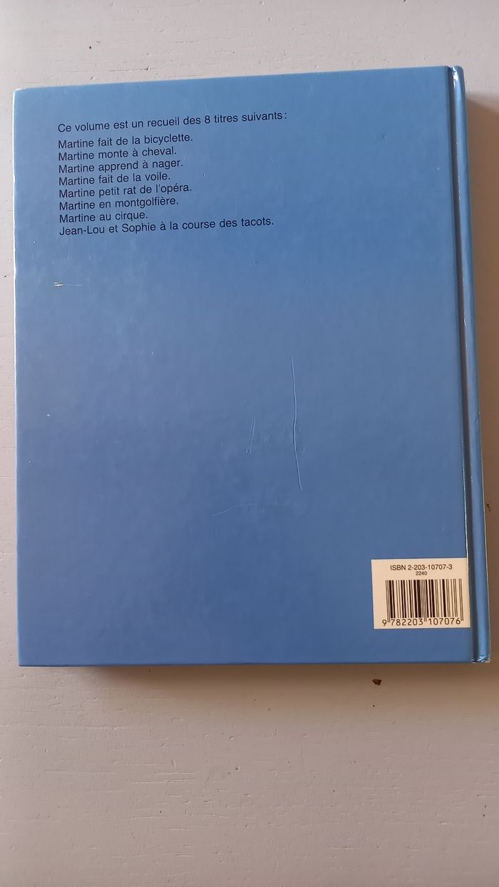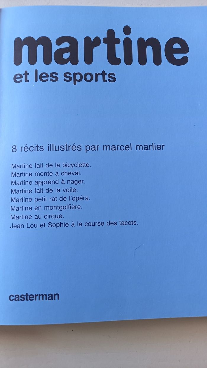 Album de huit histoires Martine fait de la bicyclette Martine monte à cheval Martine apprend à nager Martine fait de la voile Martine petit rat de l'opéra Martine en montgolfière Martine au cirque Jean-Lou et Sophie à la course des tacots Tranche du livre tâchée sinon très bon état des pages. Édition Casterman 1986.