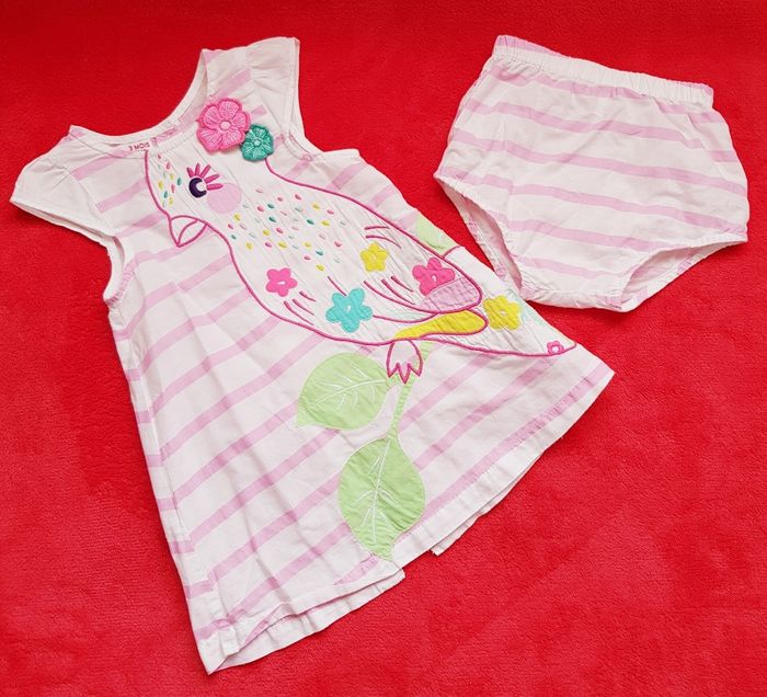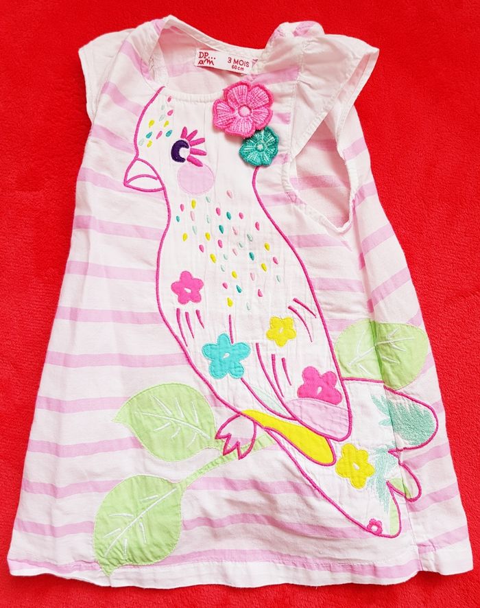 Robe avec culotte assortie de la marque DPAM - Multicolore - Motif : oiseau avec fleur en relief - Manche courte - Ouverture boutonnée dans le dos - Culotte taille élastique - Léger pour l'été - Taille : 3 mois ❌ Excellent état comme le montre les photos ✅ Réductions activées : 5% dès 3 articles 10% dès 5 articles ✅ Envoi rapide (dépôt sous 24/48h) et soigné