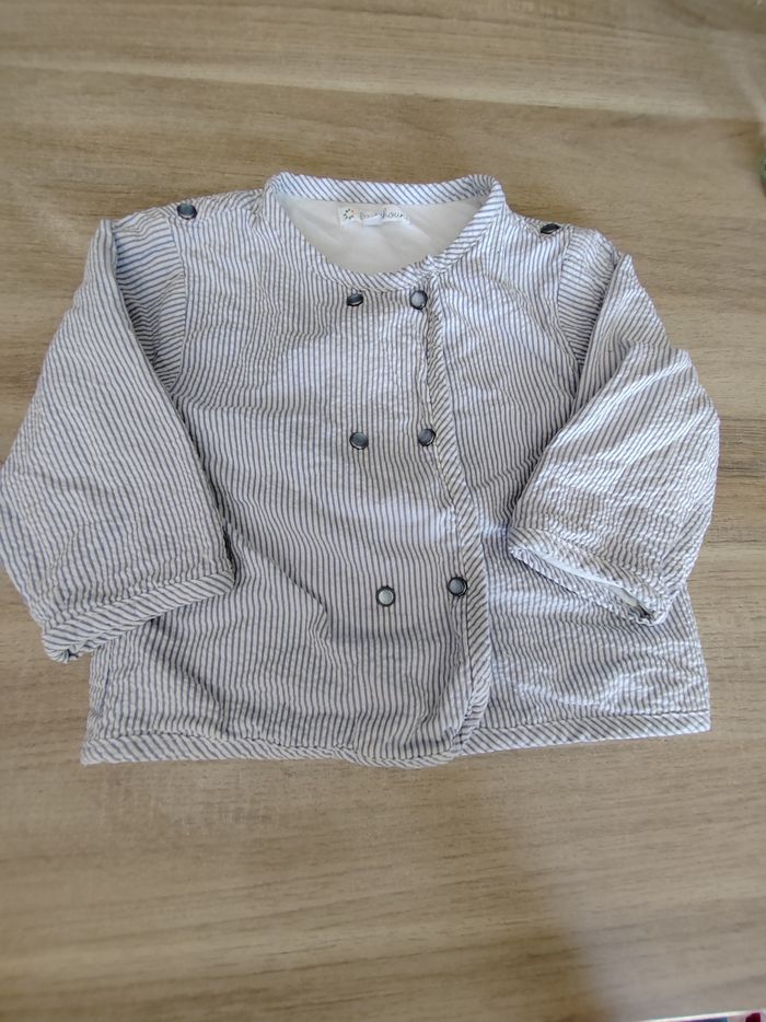 Veste 12 mois rayée blanc et bleu. Très bon état. Marque kitchoun. Bouton à pression.