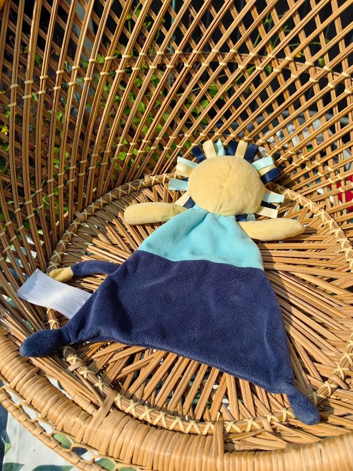 Doudou plat Lion Bleu marine, bleu ciel et jaune Inscription "petit Roi" Parfait état