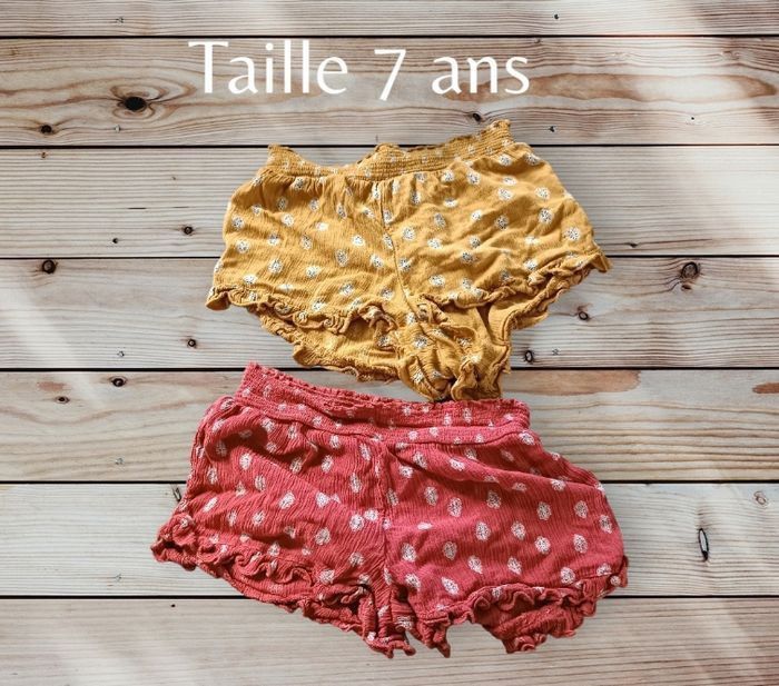 ✨Lot de deux shorts en très bon état car peu portés ✔️Manque une étiquette sur un des shorts qui gênait. 🔖Marque :Kiabi 📏Taille:7 ans 🎨 couleurs : ocre, rouge et blanc 📨Envois rapide et soigné