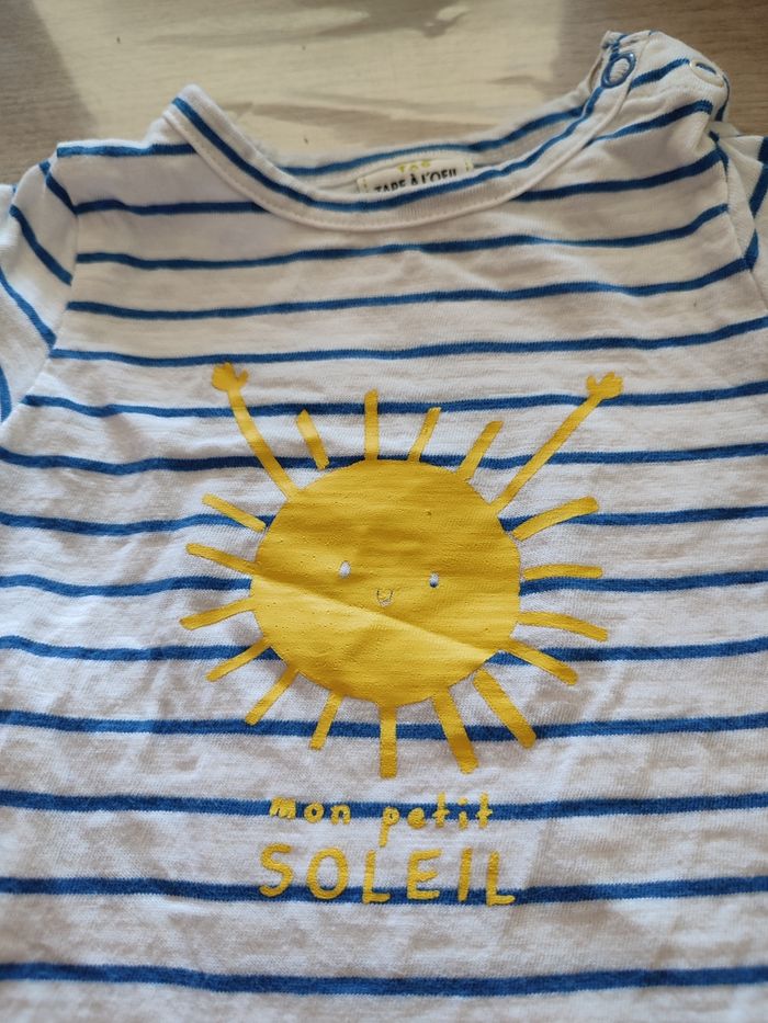 T-shirt en très bon état. Tape à l'oeil " mon petit soleil ". 6 mois 68 cms.
