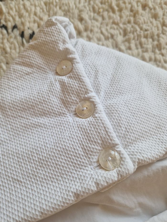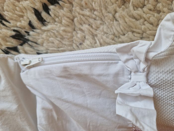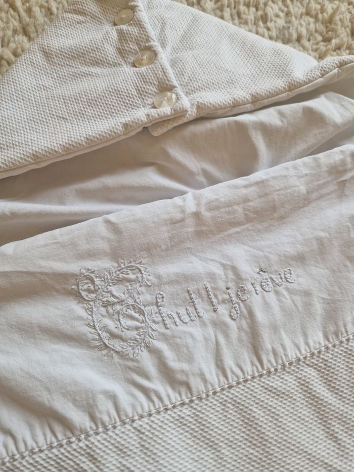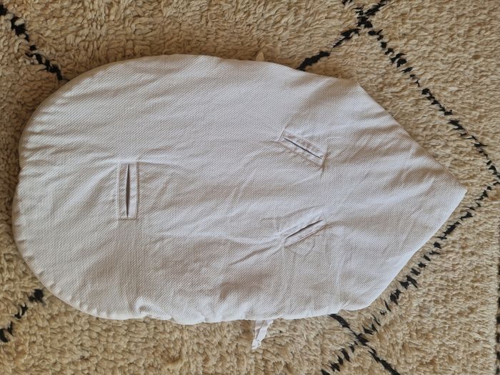 Superbe nid d'ange mixte faisait office de couverture, turbulette pour maintenir bébé au chaud Parfait pour la sortie de maternité Brodé main : Chut je rêve Fentes pour laisser passer les bretelles du cosy Taille 0-3mois Utilisé qqs fois Très bon état Aucune tâche Modèle similaire vendu 89€ actuellement