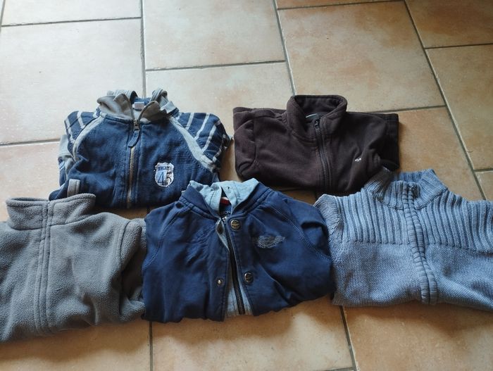 Lot 5 gilets Différentes marques dont Disney, Aston Martin, orchestra ... Taille 4, 5 et 6 ans mais taille t a peu près tous de la même façon (correspond environ a du 5 ans)