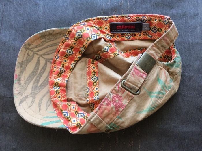 Casquette Catimini T2, tour de tête réglage à l’arrière grâce à sa boucle métal (du 6 au 18 mois environ), de couleur beige avec motifs multicolore jungle, une petite poche à rabat à l’avant et une étiquette brodée sur le côté qui lui donne un style baroudeur. Comme neuve. Maison non fumeurs et sans animaux. Envoi rapide et soigné.