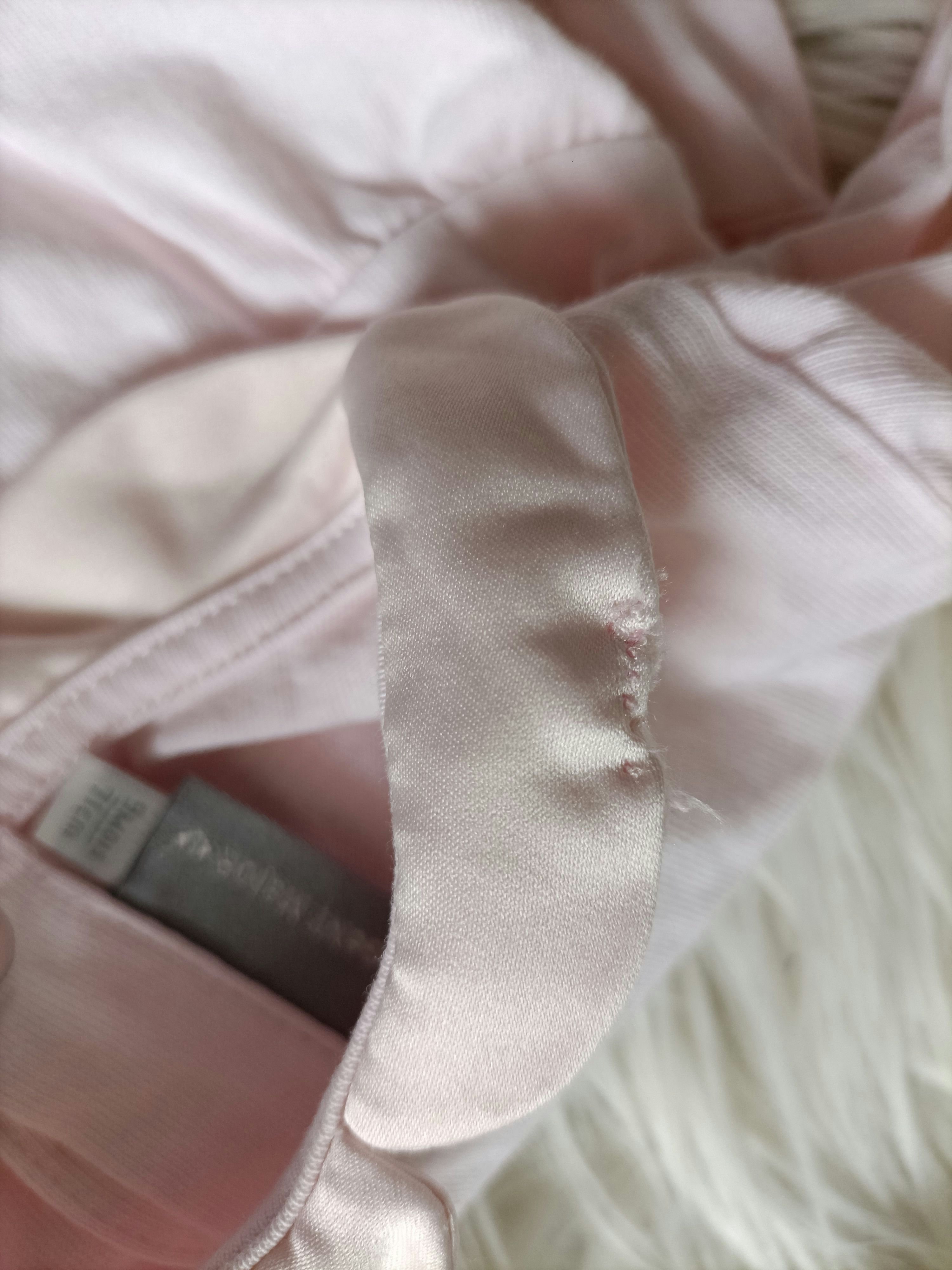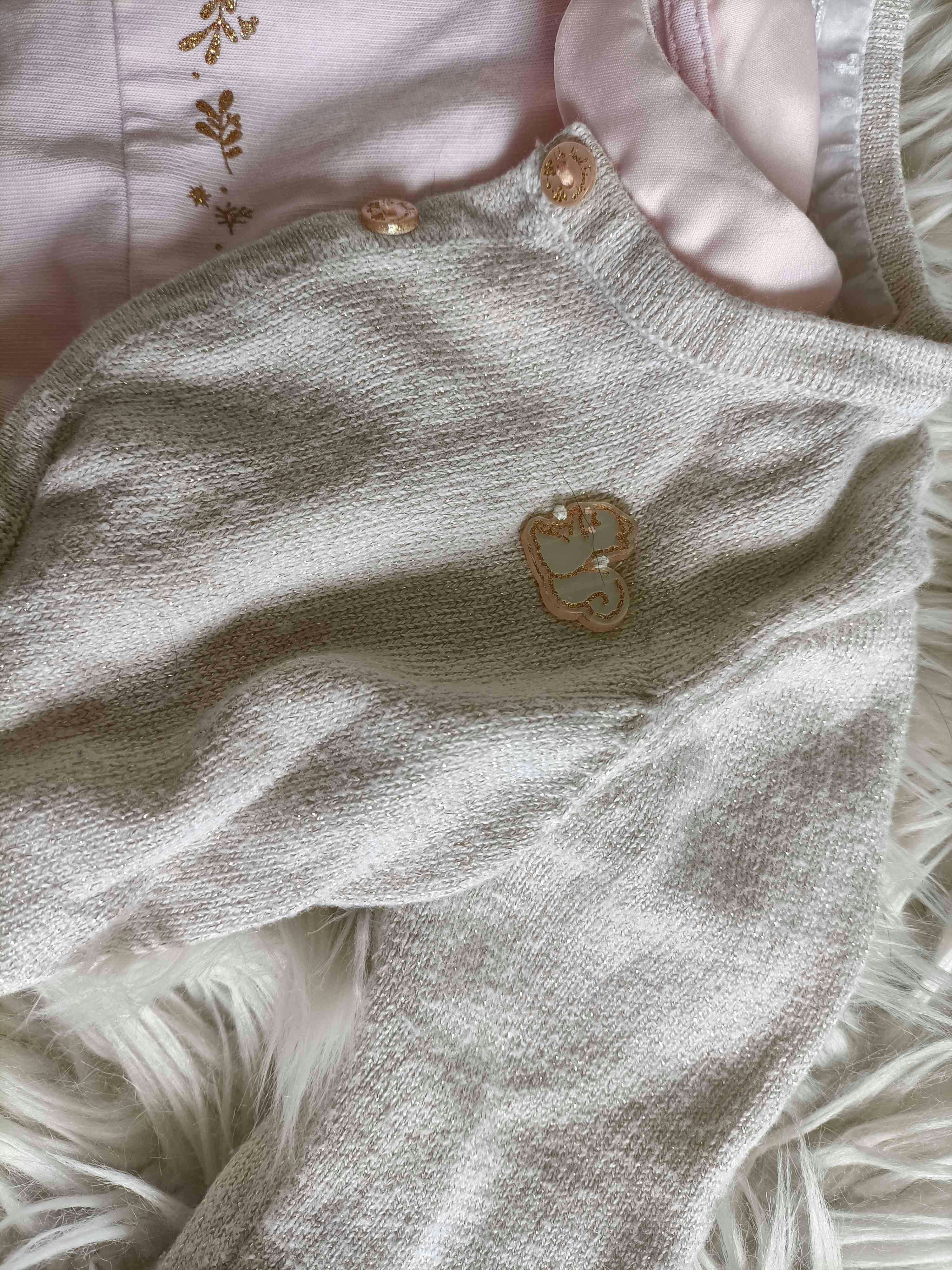 Ensemble blouse rose pâle et son gilet beige à paillettes dorées. Même collection, ensemble acheté chez SERGENT MAJOR. Je peux aussi les vendre séparément. Le gilet est en parfait état avec un petit écureuil en déco. J'ai dû reprendre la blouse au niveau du col car la couture se défaisait (cf photo). Rien d'autre à signaler.