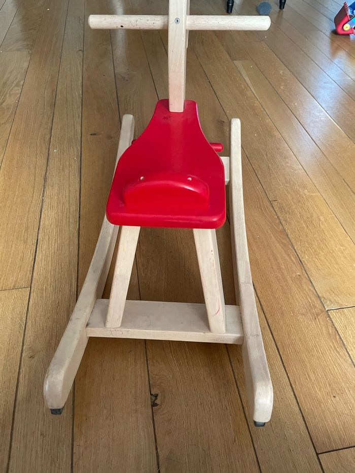 Cheval à bascule évolutif. En bois. Dim. du cheval monté : L 71 x l 34 x H 50 cm. Assise : H. 27 cm. Arceaux latéraux et dossier amovibles. Finition : peinture à base d'eau.