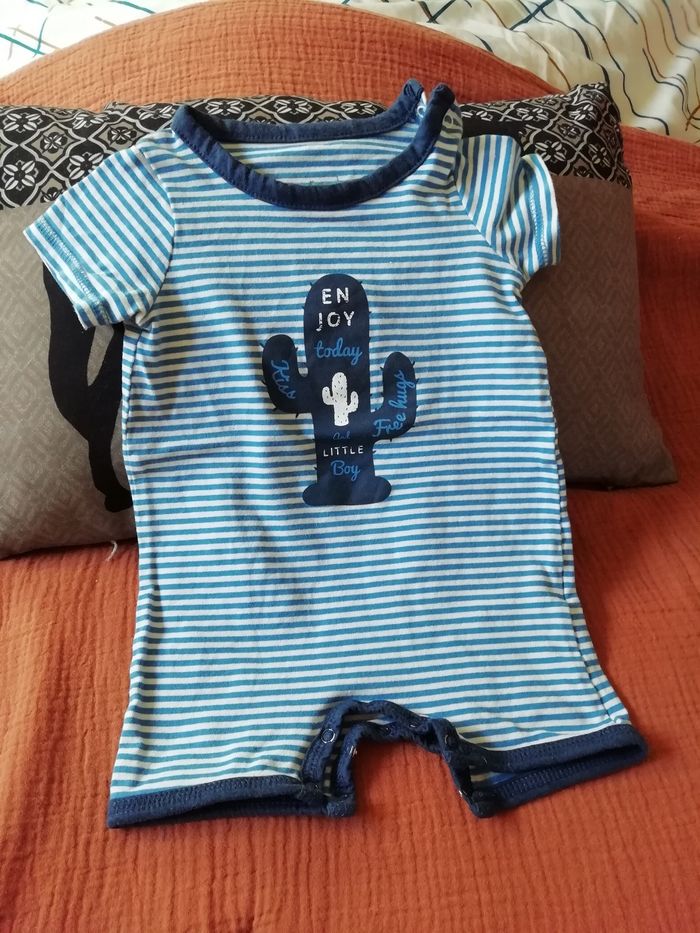 Tenue été légère manche courte Couleur bleu à rayures blanches Motif petit cactus sur le devant🌵 Fermeture à pression Très bon état 😀
