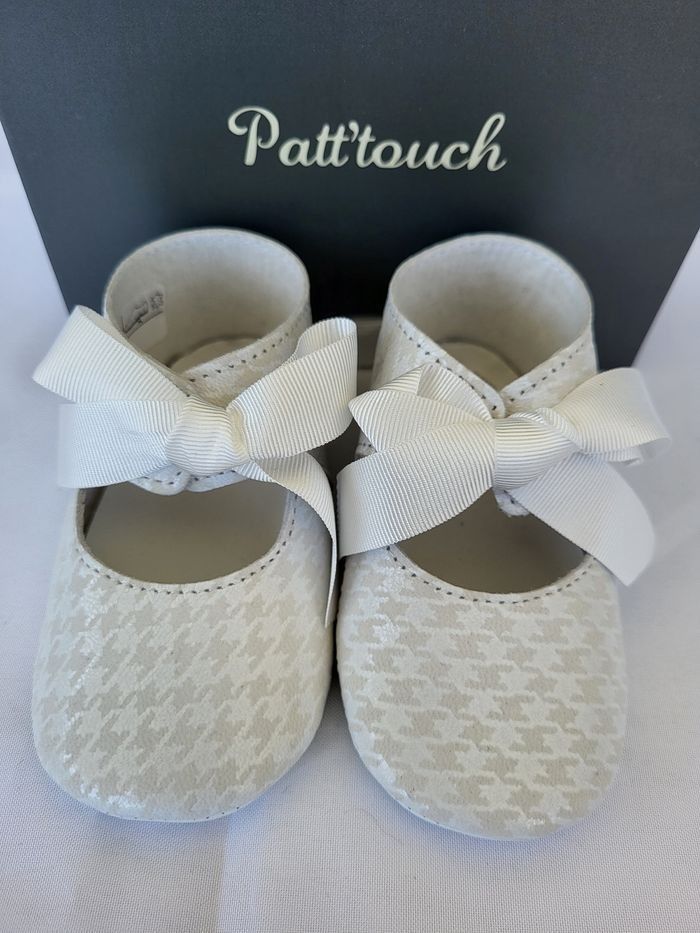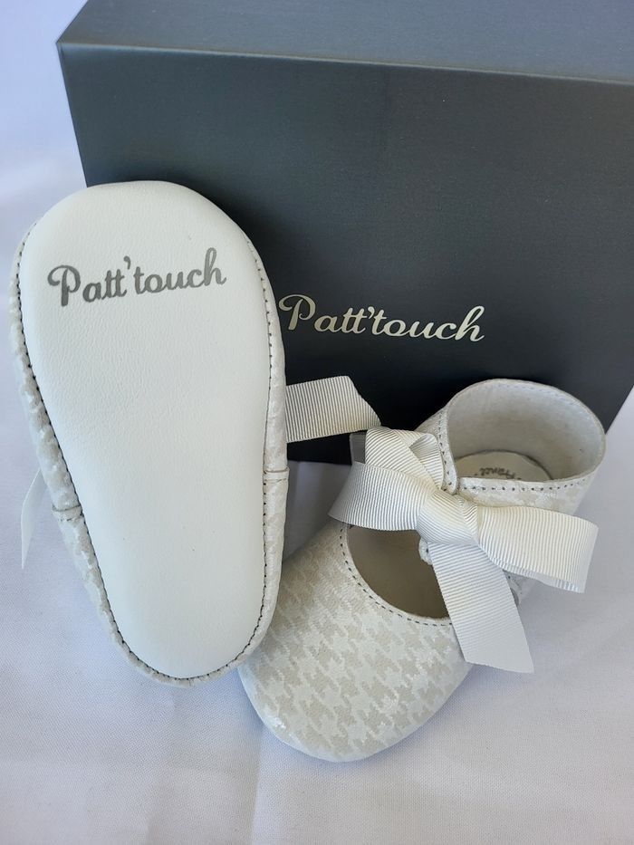 Charles IX pour bébé couché tout en cuir souple blanc impression pied de poule, semelle intérieure en cuir blanc. Fabrication 100% Française Pointure 20 (6-12 mois) Longueur semelle intérieure environ 11 cm Emballage en coffret gris avec ruban, idéal pour offrir ou se faire plaisir !