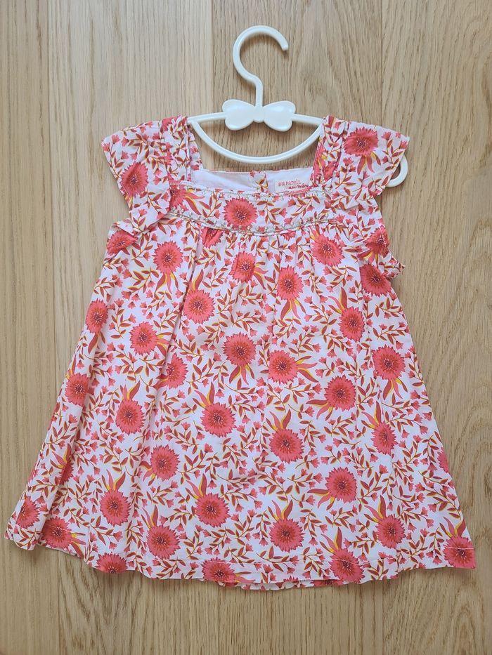 Robe couleur corail et un petit touche du couleur jaune et doré.