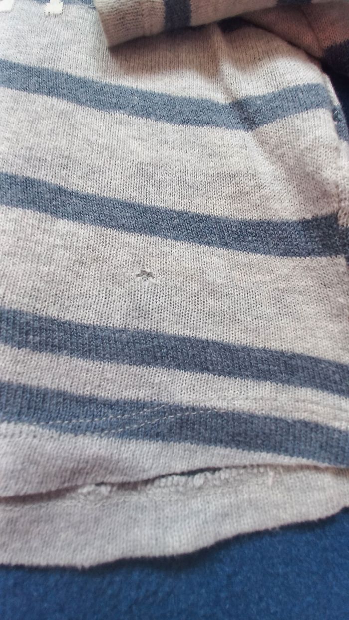 En bon état (traces d'usure générale). Il est léger, 100%coton. Petit trou (voir photo) Marque Complices.