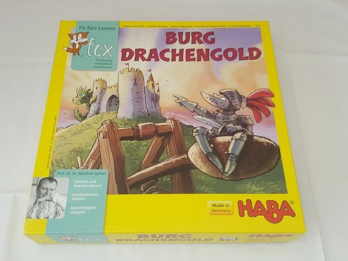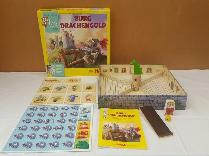 Jeu de société "Le château de Dragonor" de chez Haba. La princesse Pâquerette a été enlevée et est gardée au château Dragonor. Les courageux chevaliers du pays se sont donc mis en route pour délivrer la princesse. Mais le courage seul ne suffit pas ! Pour réussir à la libérer, il faut être adroit et intelligent. Seul celui qui catapultera les chevaliers au bon endroit dans le château et saura résoudre une énigme pourra délivrer la princesse et conquérir son cœur. Un jeu d’action avec différentes variantes pour augmenter le degré de difficulté. Un coin de la boite abîmée voir dernière photo sinon en parfait état, jamais joué avec, d'ailleurs toutes les pièces n'ont été détachées. 100% complet avec règles du jeu.