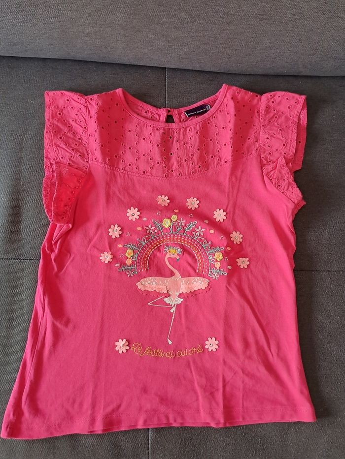 Très joli tee-shirt, rose fushia, avec comme de la dentelle ajourée au niveau des manches et de l'encolure. Joli flamant rose sur le devant tout orné de fleurs autour. Taille 9 ans. Très bon état.