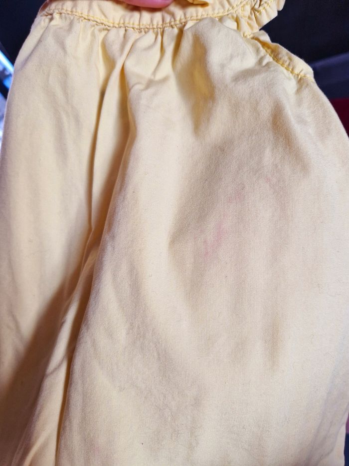 3 mois, marque Kiabi Petite tâche rosée très légère, ne se remarque pas porté si on ne le sait pas (voir dernière photo)