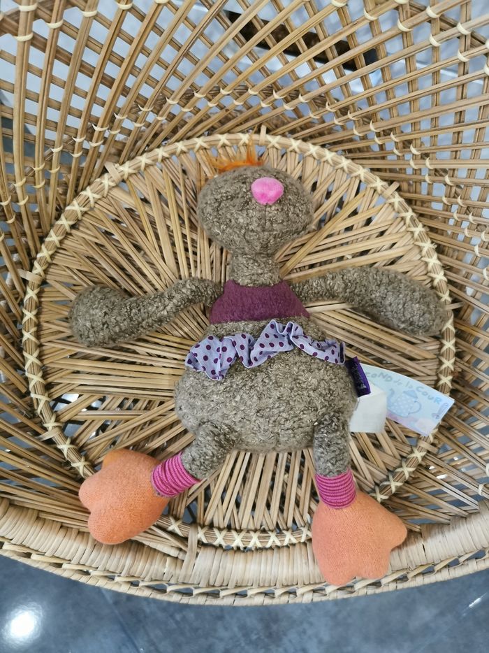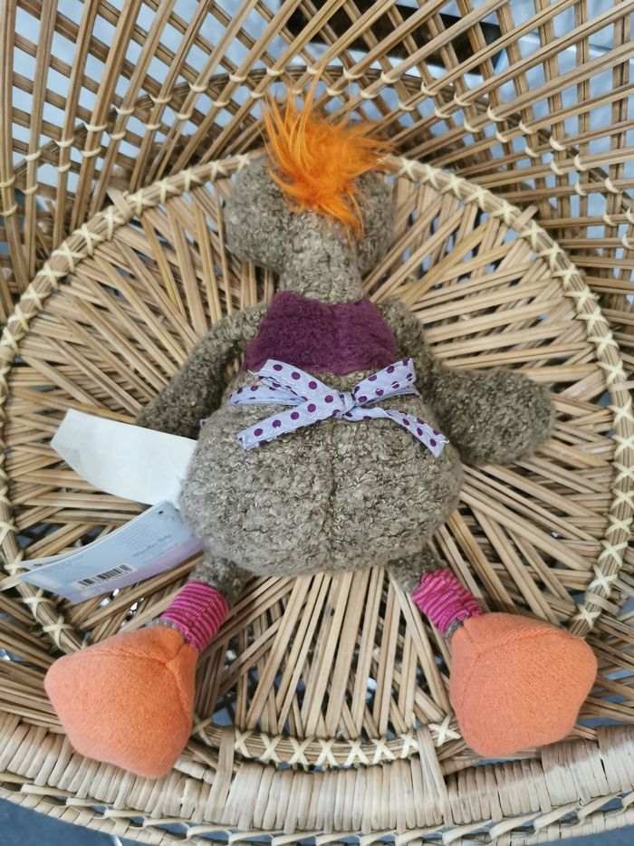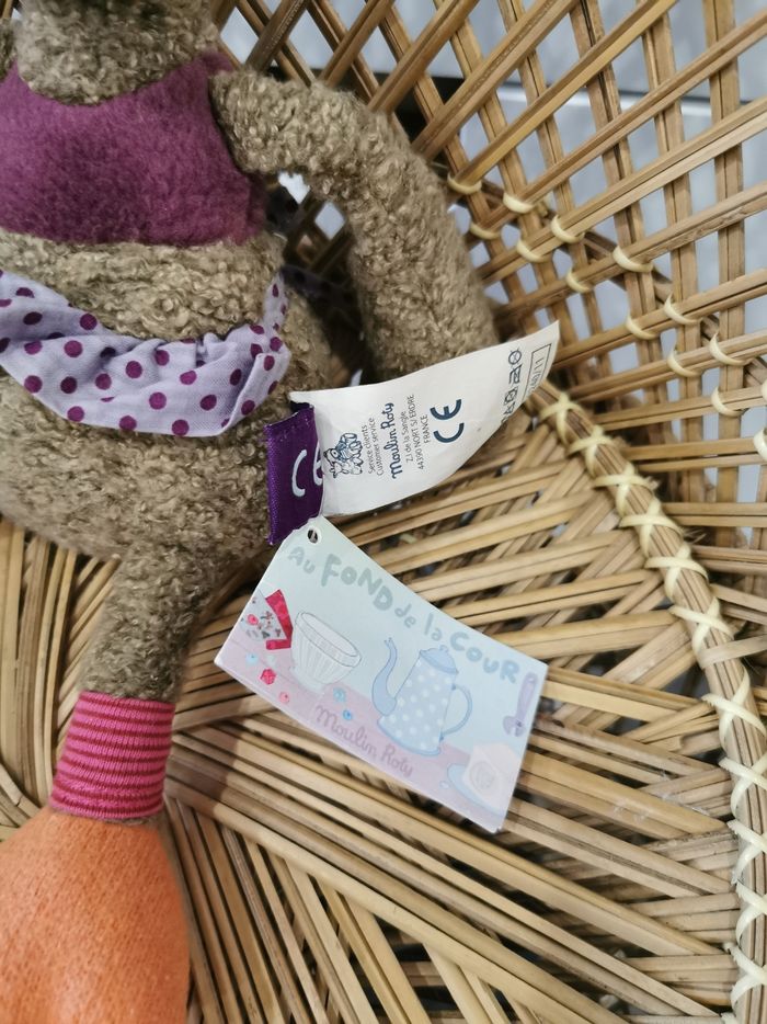 Doudou peluche poule Moulin roty Peluche pou-poule (poule, ou oiseau ou autruche ?) Au fond de la cour Moulin Roty Corps marron/kaki, Tablier violet, bec rose et cheveux crète orange Neuve avec étiquette