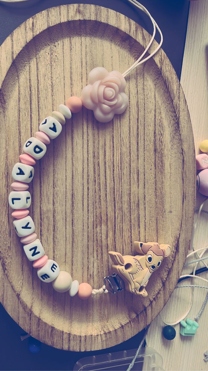 Je crée des attaches tétine personnalisées pour les bébés. Mes attaches tétine sont non-toxiques, durables et faciles à utiliser. Je peux personnaliser chaque attache tétine avec le nom de votre bébé ou un design unique. Si vous cherchez un cadeau personnalisé pour un nouveau-né, contactez-moi pour en savoir plus sur mes attaches tétine !"