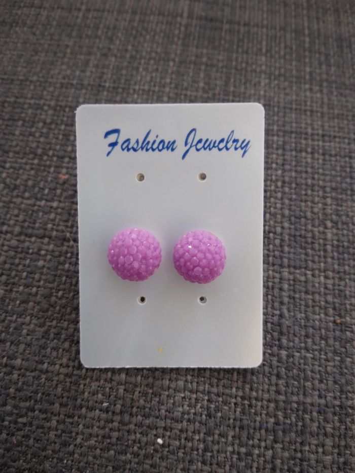 Paire de boucles d'oreilles neuf En forme de boules de couleur violet avec pailletées (Voir les 3 photos) Le couvercle de la boîte est un peu fissure D'autres bijoux et maquillages pour filles sont en ligne