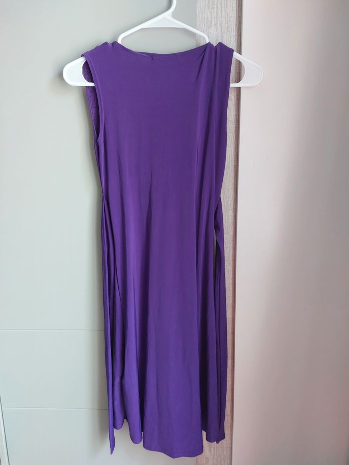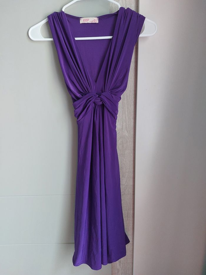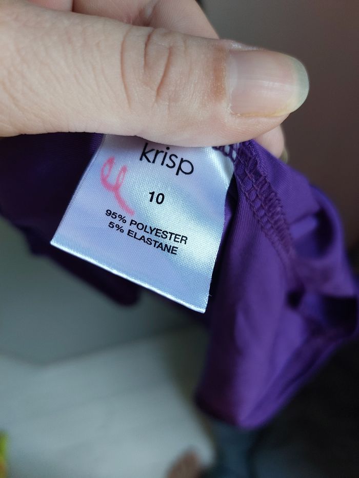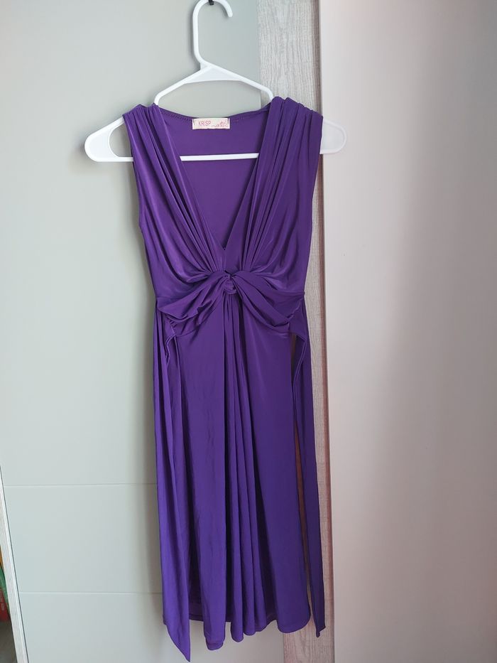Tissu fluide et satiné, à nouer, marqué taille 10 us donc 42 fr mais taille plutôt 38/40. Achetée en tant robe courte mais mise en tunique. Disponible en une autre couleur
