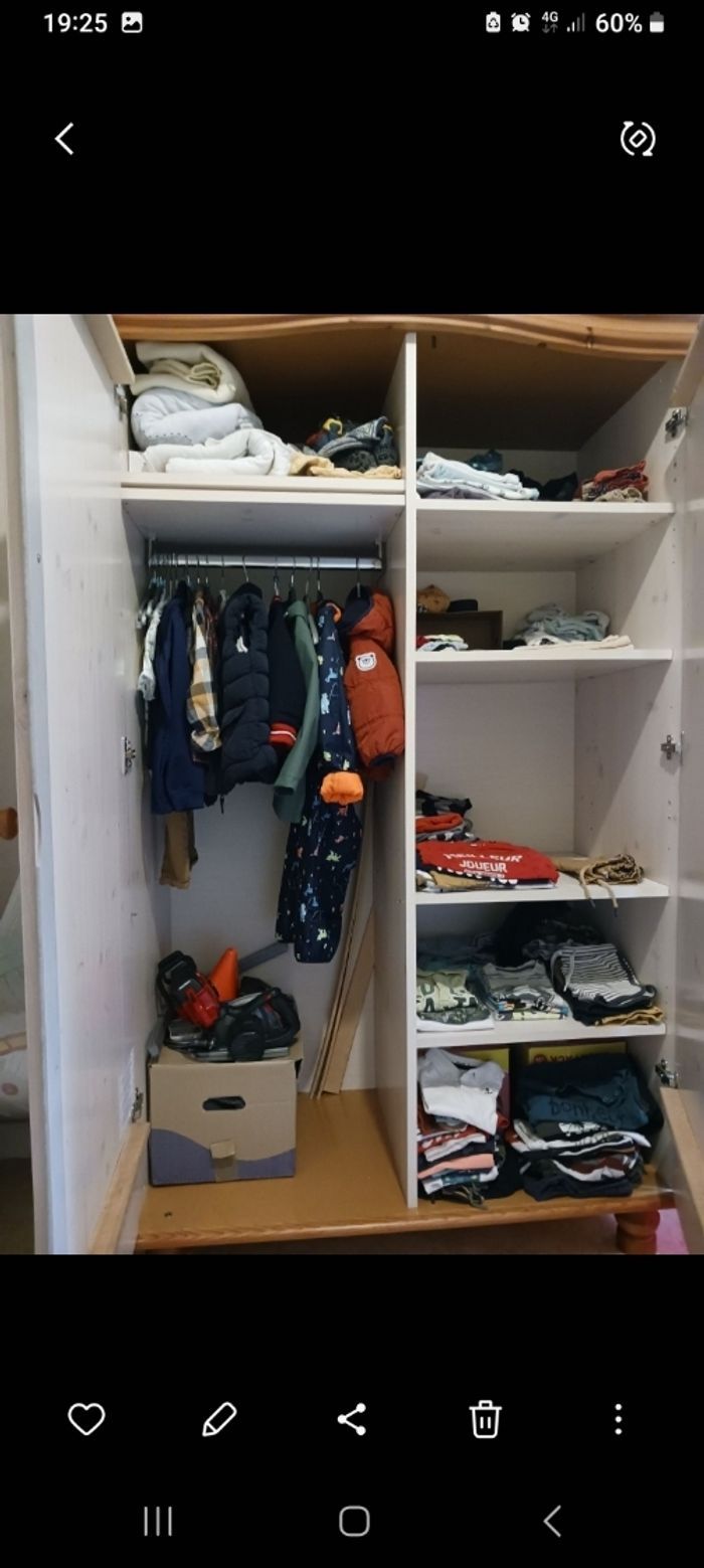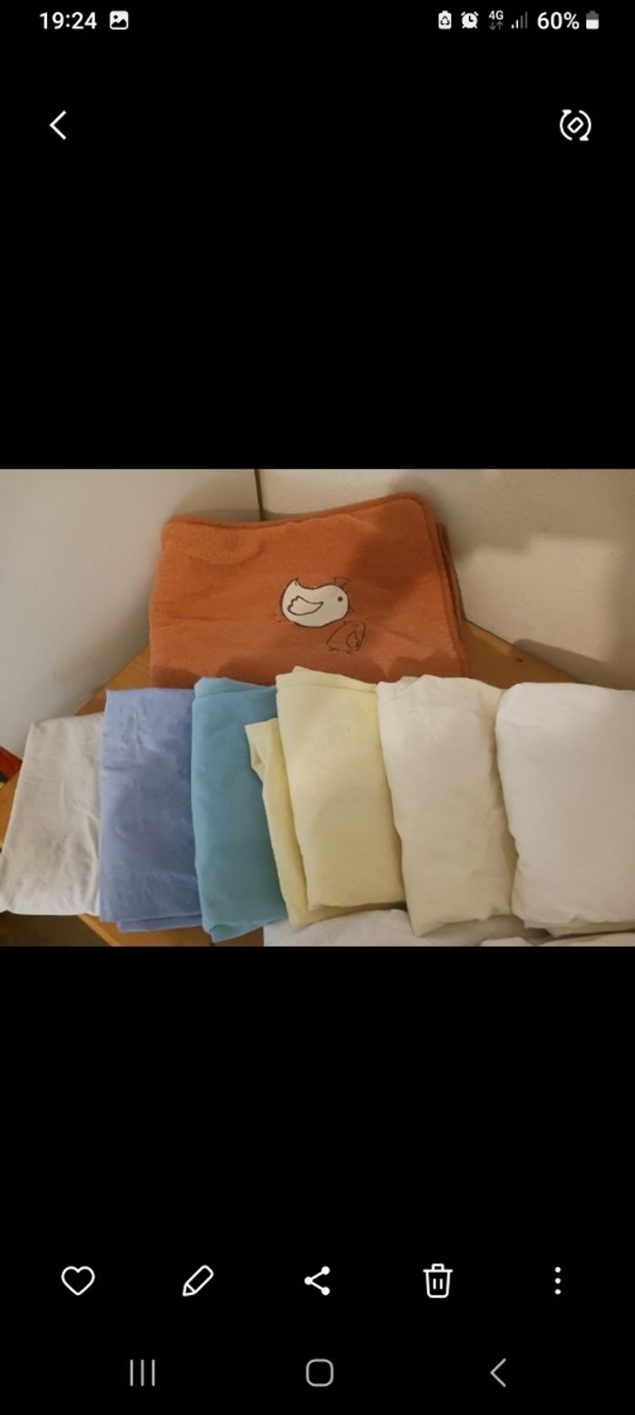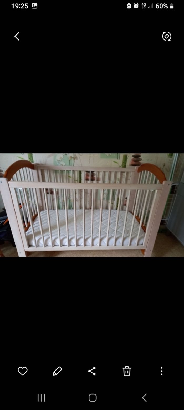 Lit à barreaux ajustable avec draps housses et une allaise, armoire penderie, commode