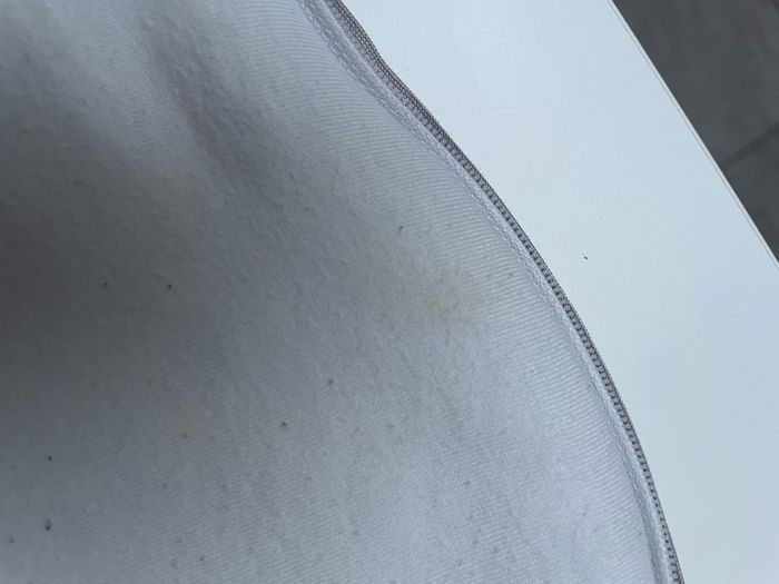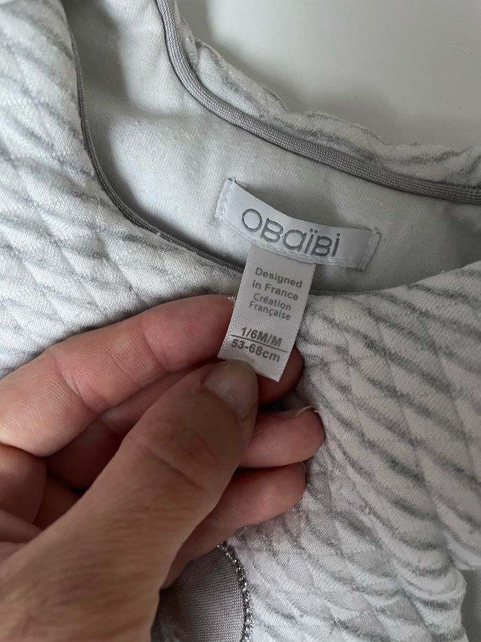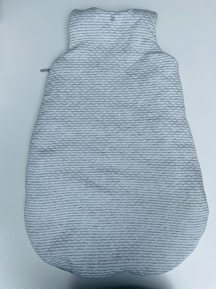 Gigoteuse blanche et grise, bon état , peu utilisée, juste une légère tâche sur l’intérieur en bas ,taille 0-6 mois .
