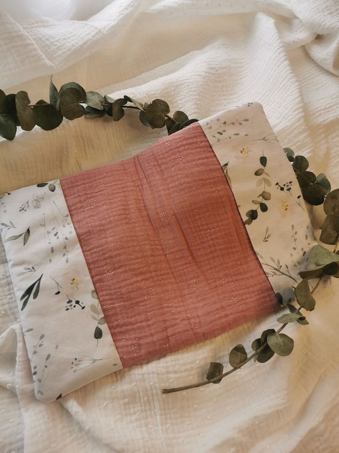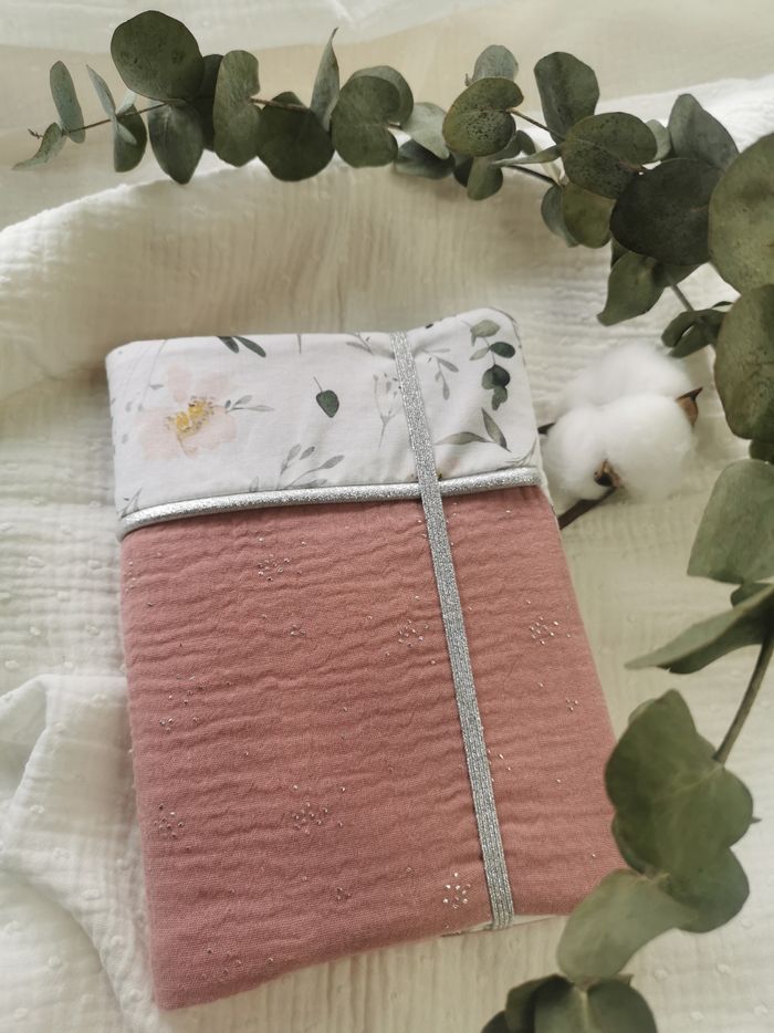Magnifique protège carnet de santé fait main double gaze vieux rose pois argenté et coton motif floral. Pro