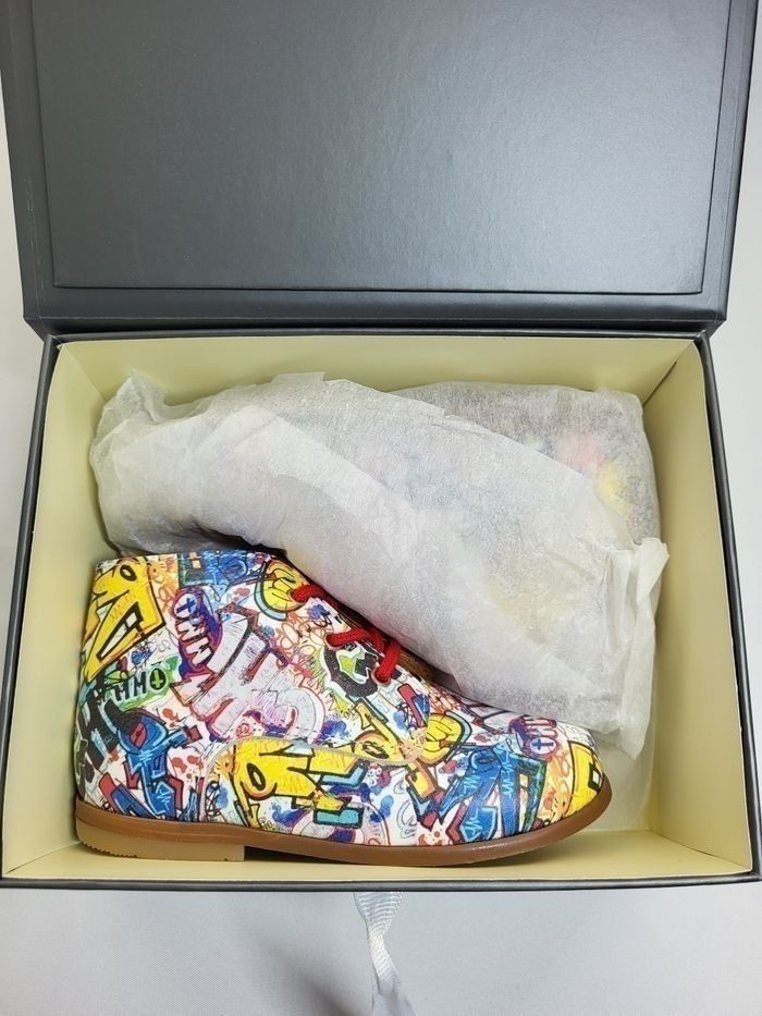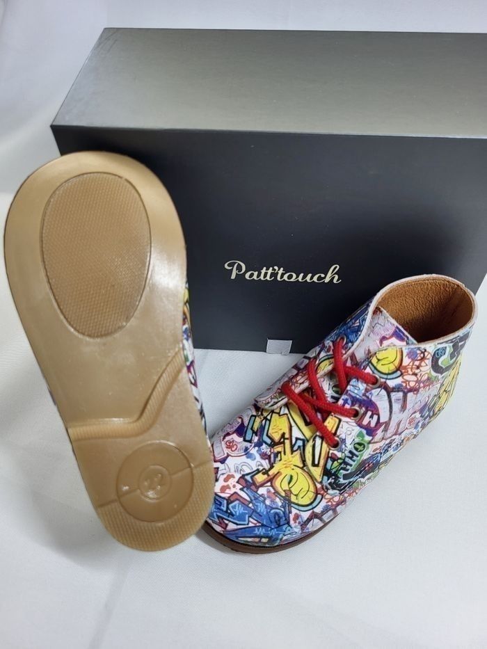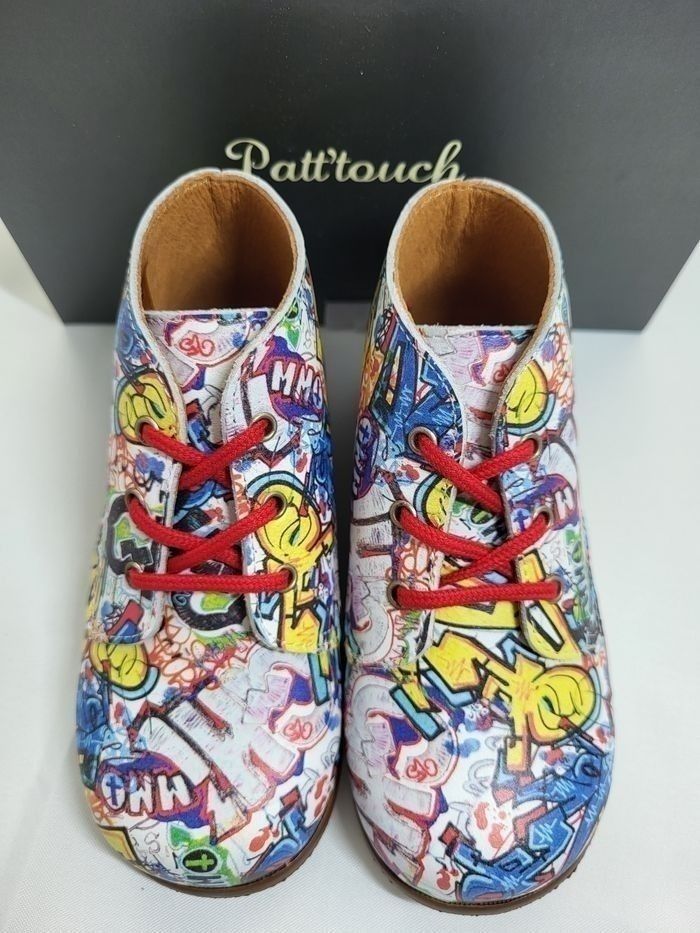 Derby tout en cuir imprimé graffiti, doublure et semelle intérieure en cuir beige, de la marque Patt'touch Fabrication de qualité 100% Française Dimensions de la semelle intérieure : longueur 13.8 cm largeur 5.3 cm Emballage papier de soie et coffret gris avec ruban