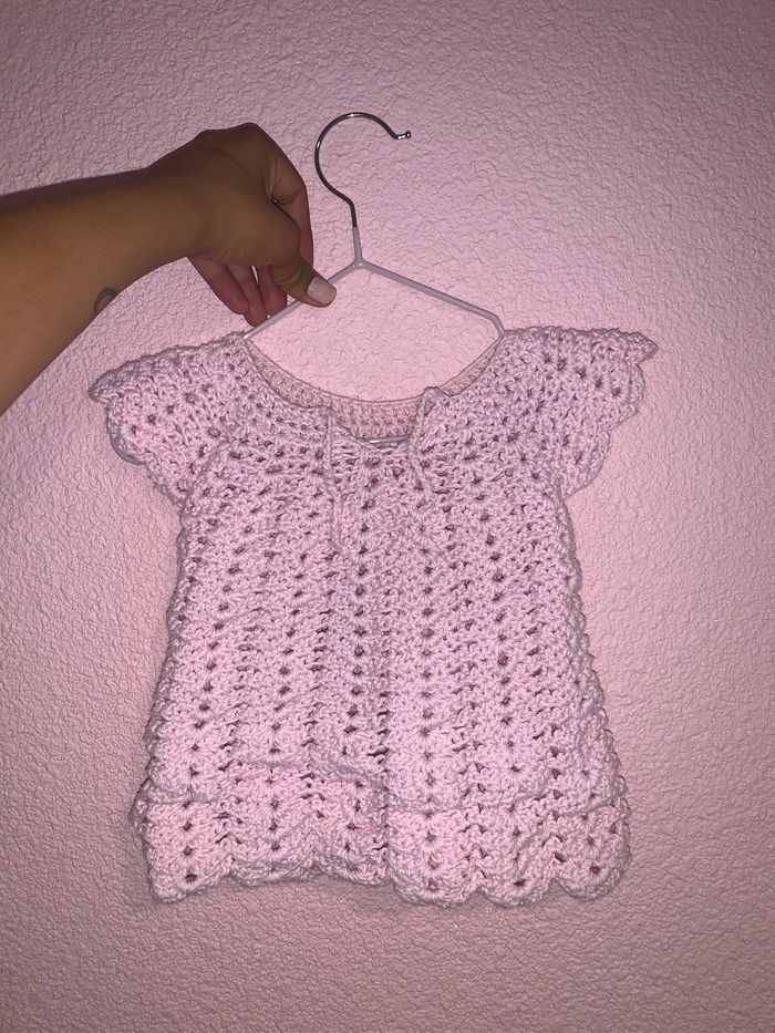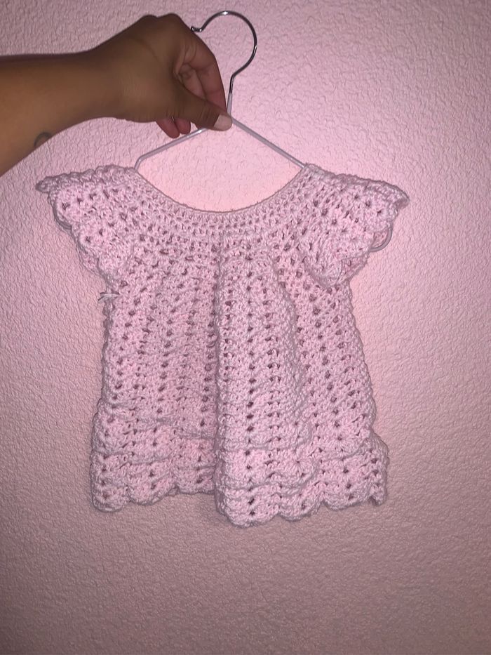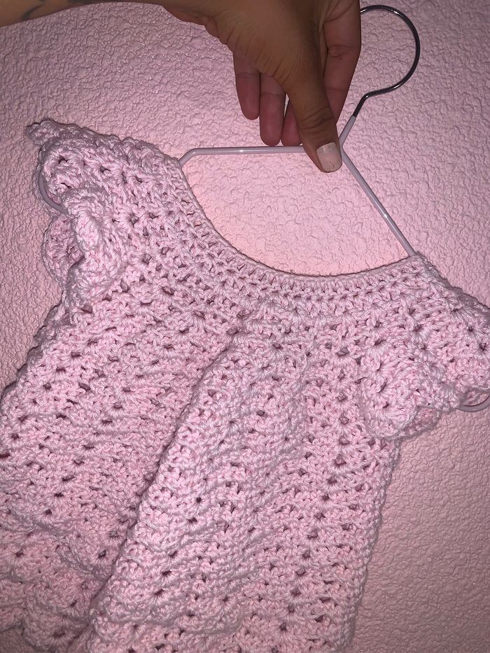 Robe tricotée mains pr ma belle mère taille pour du 0-3 mois très bon état . Petit prix et réduction sur lot appliquée -15% des 3 articles et -30 des 5 articles