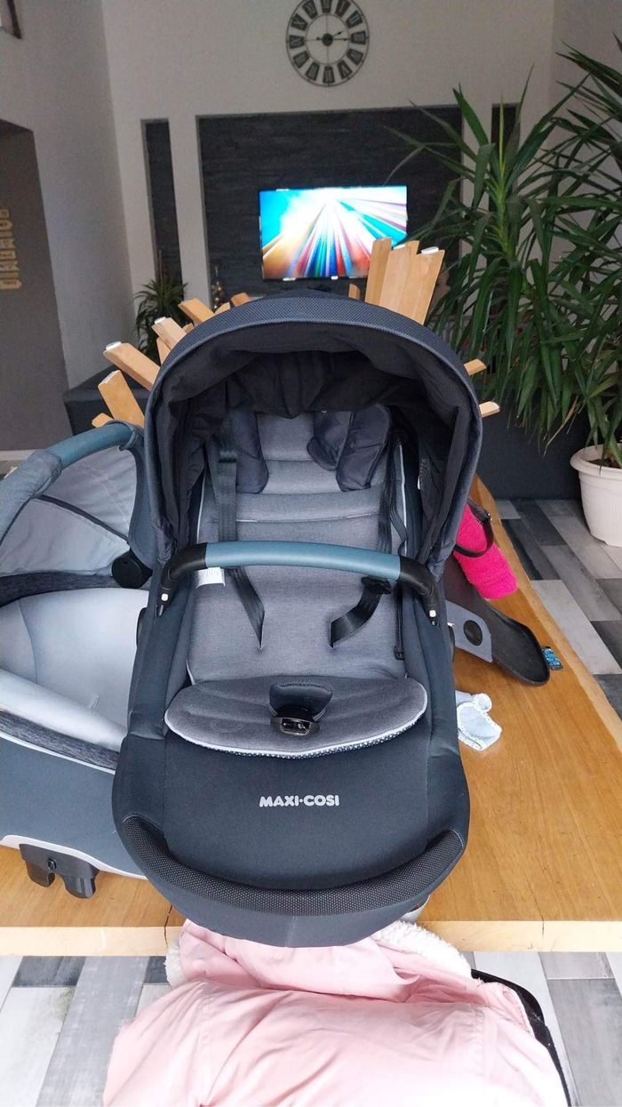 Bonjour je vend ma poussette trio lila sp essential graphite de chez maxi cosy Acheter chez Aubert Valeur d’achat 1400€ Prix de vente non négociable En très bonne état aucune tache aucune rayure Servis très peut Idéale pour la campagne comme pour la ville les sorties parc de jeux attraction …bébé est parfaitement alaise et en sécurité Acheter il y a 10 mois Comprend Adaptateur cosy et nacelle cosy 0/9 mois avec réducteur nouveau née Nacelle isofix homologuer voiture avec réducteur nouveau née Poussette avec moustiquaire intégrer Habillage pluie neuf! Encore sous garantie