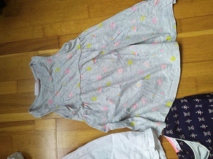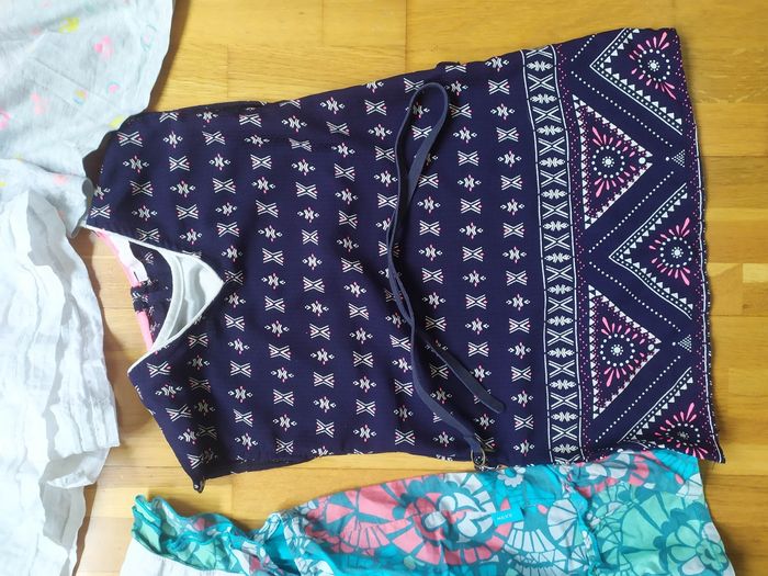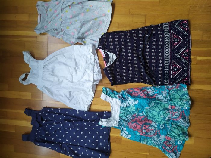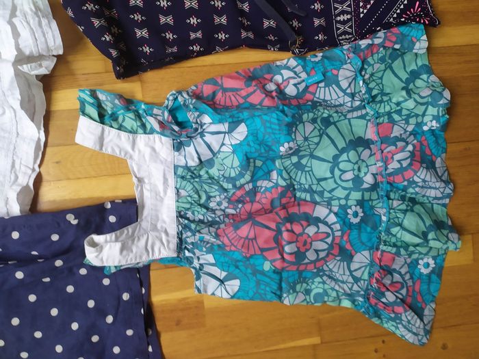 1 grise motifs colorés (étiquetée 3ans mais taille petit et correspond à une taille 2 ans) 1 blanche tout compte fait. Petites broderies 1 bleue Marine à pois beiges petit flot h&m 1 très colorée mexx 1 esprit ethnique gemo Toutes en parfait état 😊
