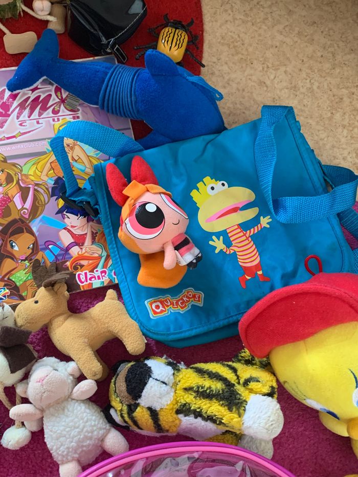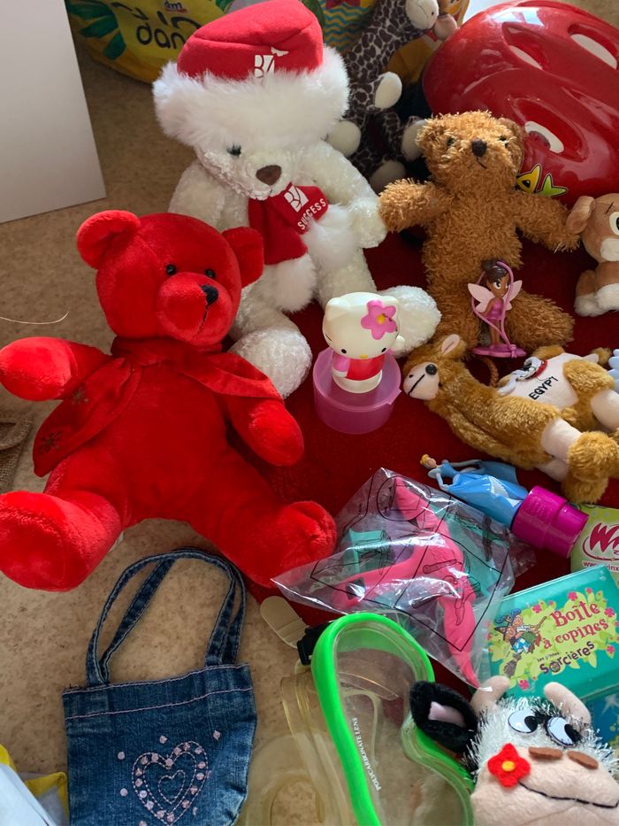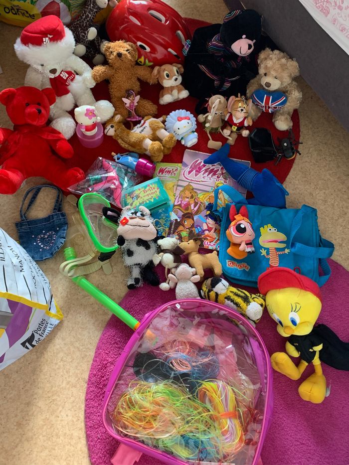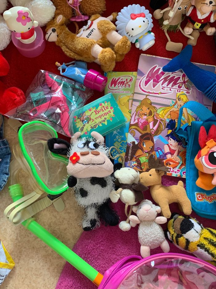 Lot de jouets , pleins de peluche, des scoubidou avec le sac rose , un sac , un tuba , un casque à vélo , deux livres winx , et d’autre choses a voir sur la photo #jouet #jouets #lotdejouets #lotdejouet #peluches #lotdepeluches #winx #tuba #casquevelo #casqueveloenfant #hellokitty #princesse #scoubidou #scoubidous #titigrosminet #titigrominet #sacenfant