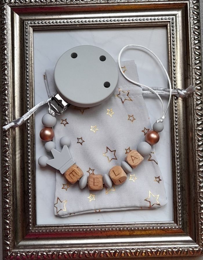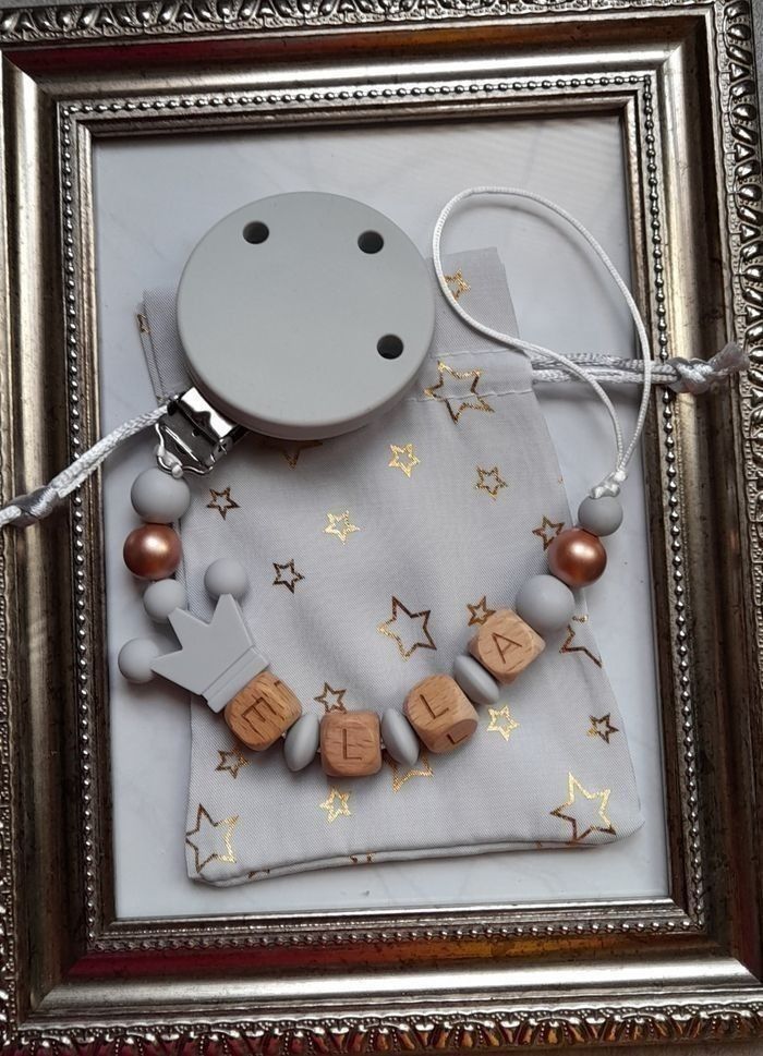 Attache tétine personnalisé avec le prénom de votre choix tout le matériel utilisé est aux normes européennes . Perles en silicone ou en bois ou un mélange selon les modèles . En respectant les normes de sécurité pour bébé ,n'hésitez pas à regarder dans mon dressing il y a plus de 150 modèles et aussi à m'envoyer un message pour plus d'informations. 🔴 une petite remarque pour les prénoms qui sont très long il y aura forcément moins de perles sur les cotés ou quelques changements sur le modèle c'est pour respecter les normes de sécurité pour bébé il y a une langueur à respecter merci pour votre compréhension. 🔴Aussi l'utilisation de l'attache doit être sous surveillance et toujours vérifier si l attache tétine est intacte et les nœuds sont toujours bien fermés pour la sécurité de nos boutchous. Je vous remercie pour la lecture de ces consignes