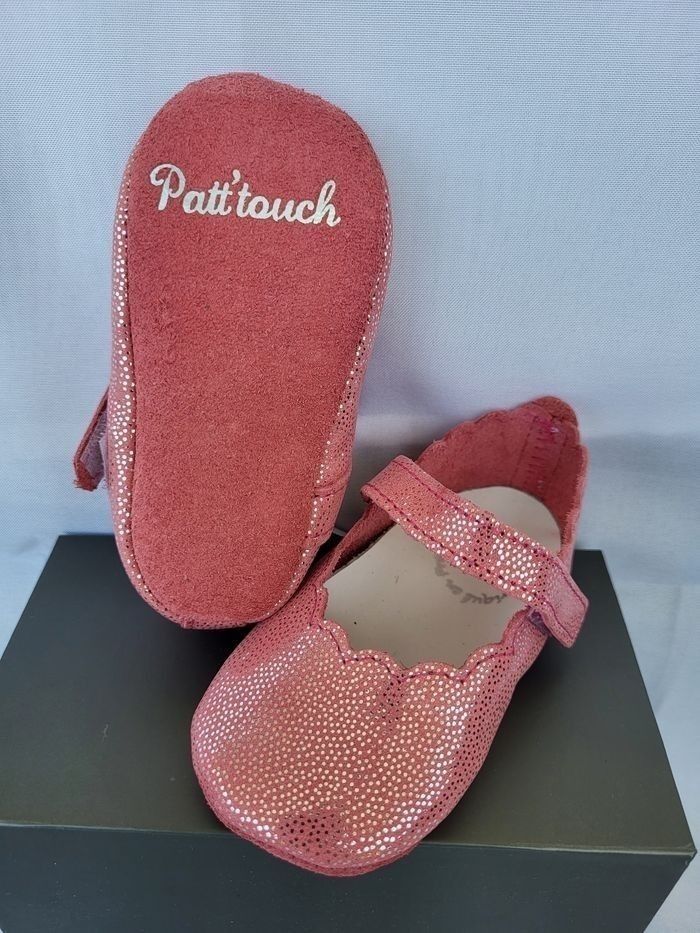 Ballerine pour bébé couché tout en cuir souple rose avec pois argentés non doublé, semelle intérieure en cuir blanc, de la marque Patt'touch Fermeture bride velcro Une marque de chaussures pour bébés et enfants avec une fabrication 100% Française Pointure 20 (6-12 mois) Longueur semelle intérieure environ 11 cm Emballage en coffret gris avec ruban écru, idéal pour offrir ou se faire plaisir ! Neuves, jamais portées Envoi sous 24h