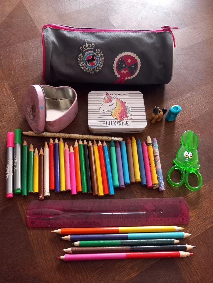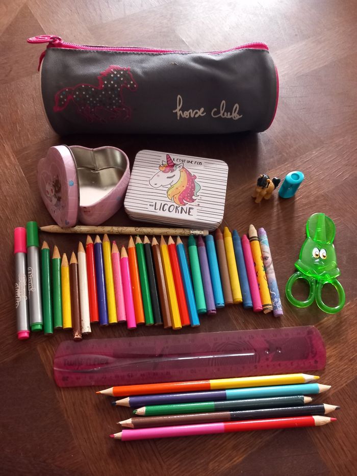 Lot fournitures scolaires comprenant une trousse, 2 boîtes à bons points ou images (licorne et jewelpet), une figurine poney, un taille crayon, une paire de ciseaux, 2 feutres diamant, un crayon à papier, des crayons de couleurs, des pastels, une règle et des crayons de couleurs bi couleurs.