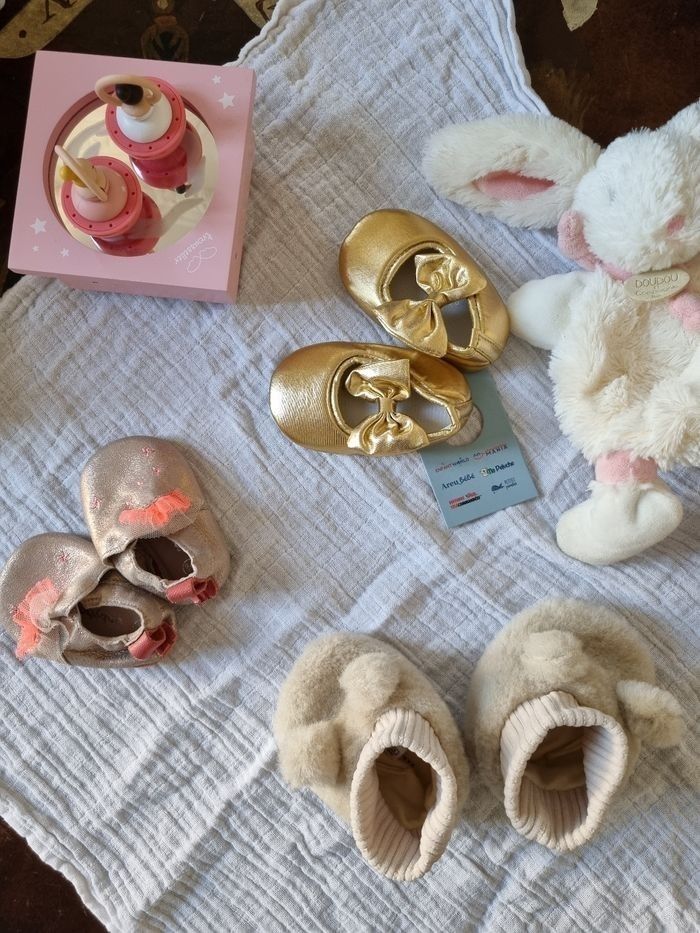 Chaussures et chaussons bébé 0-6 mois État neuf 2 paires de chaussures dont une jamais portée (Moulin Roty) 1 paire de chaussons (Zara) Neufs 70€ Vendus 12€