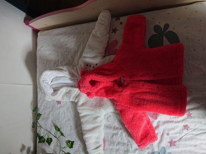 2 manteaux épais le blanc avec moufles au bout des manches 3 mois marque kimbaloo pour le rouge et kitchoun pour le blanc.
