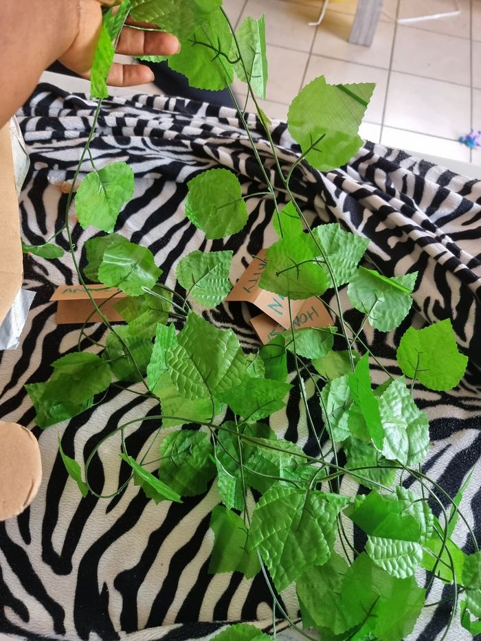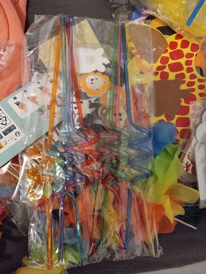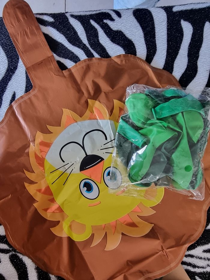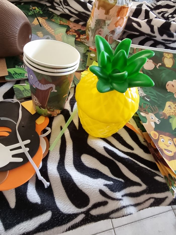 16 pailles fantaisies , 26 gobelets neuf,10 bûches marque- place( je les ai utilisé pour marquer le prénom de mon fils ), 2 guirlandes feuilles de liere (2metres chacun)12 feuilles déco table , 2 feuilles déco cadeau , 10 ballons vert 1 ballon lion , 10 indicateurs terre de calcul de la forêts , un présentoirs de cup cake, couvert en bois 48 voir plus, déco cake 40 . 2 nappe de table , 3 cônes,]28 masques,1 fanion, 44 piques cocktail, 11 poche cadeaux, 1 décoration arriere plan (happy birthday)2 cartons d'invitation,tatouage,arrière plan déco happy birthday. 6 gobelets ananas avec pailles,6 gobelets noix de coco, 23 colliers hawaïens