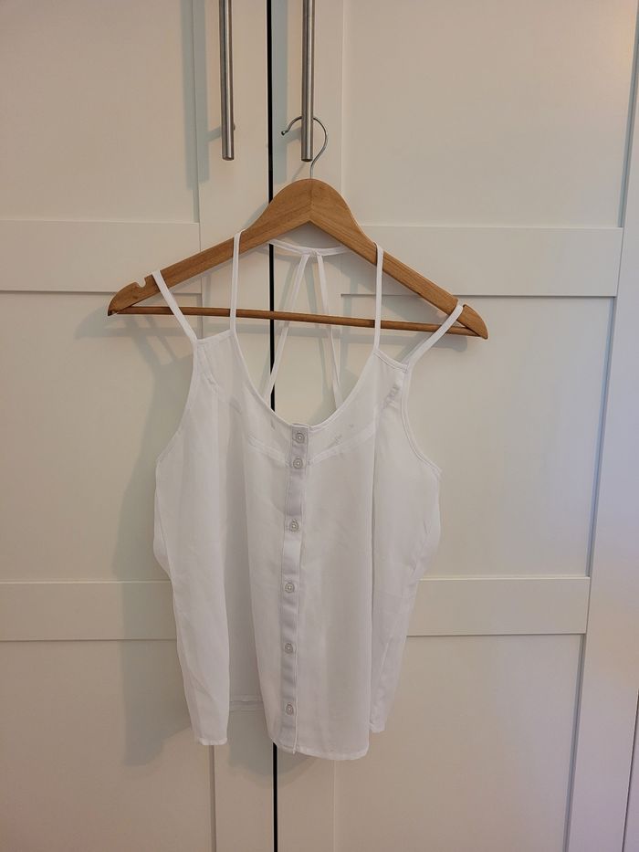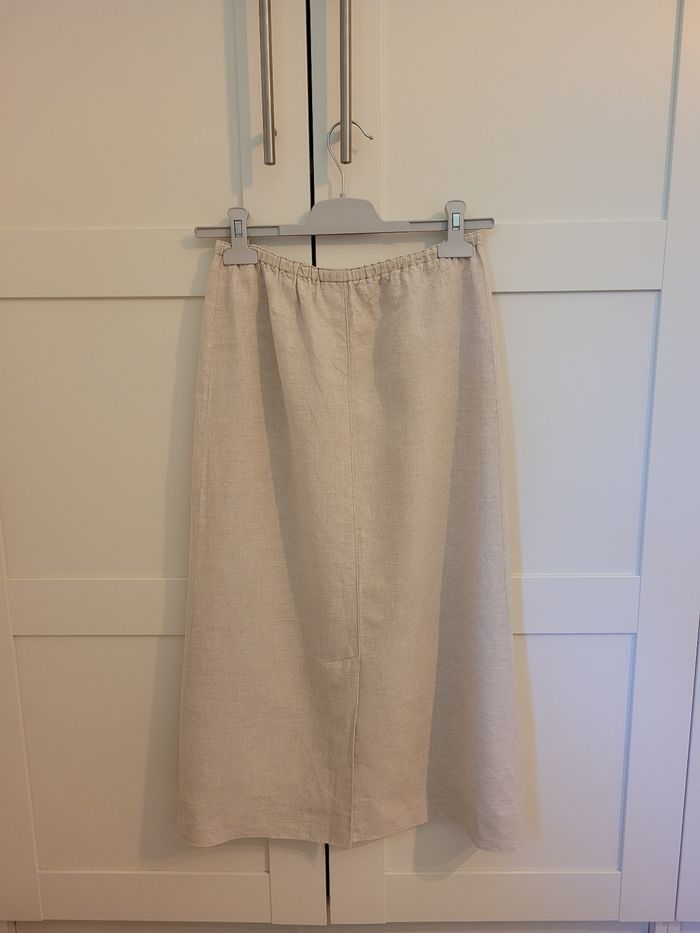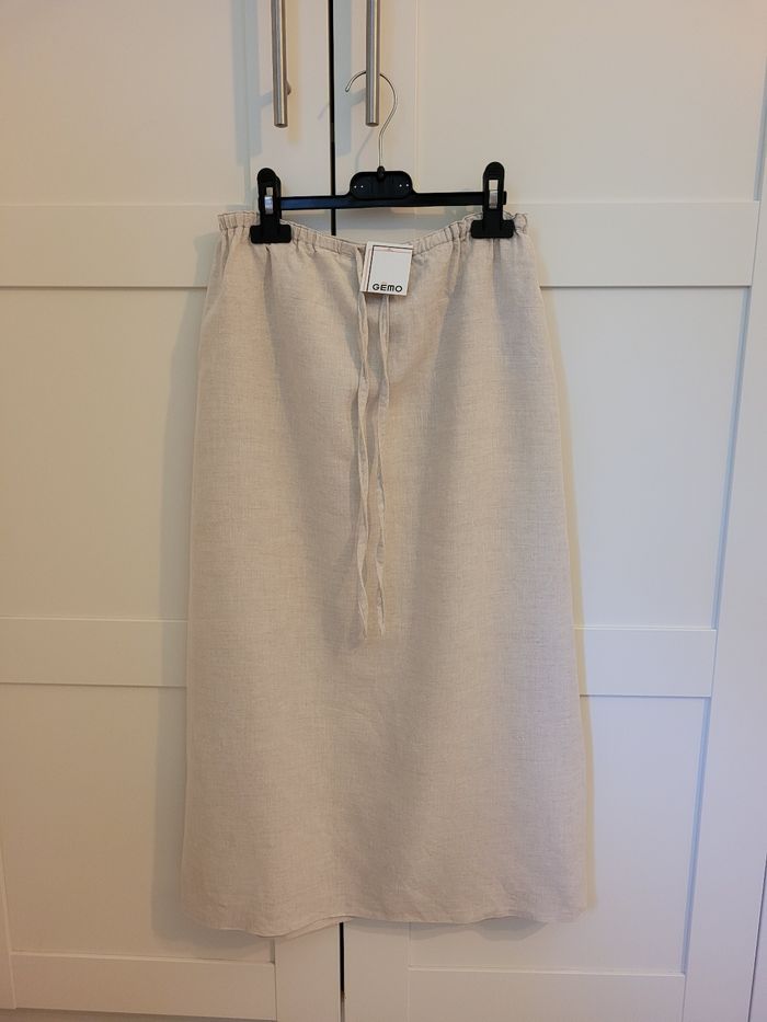Ensemble taille 36 comprenant : - 1 jupe longue GÉMO, coloris lin, NEUVE avec étiquette, et - 1 top blanc JENNYFER, à fines bretelles (étiqueté M mais équivalent à un 36), en TRÈS BON ÉTAT.