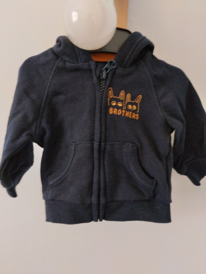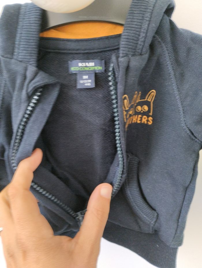 Gilet avec capuche, fermeture à éclair. Taille 1 mois. Marque Kiabi. Très bon état.