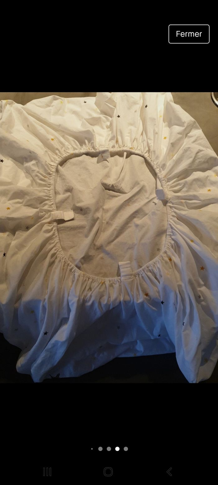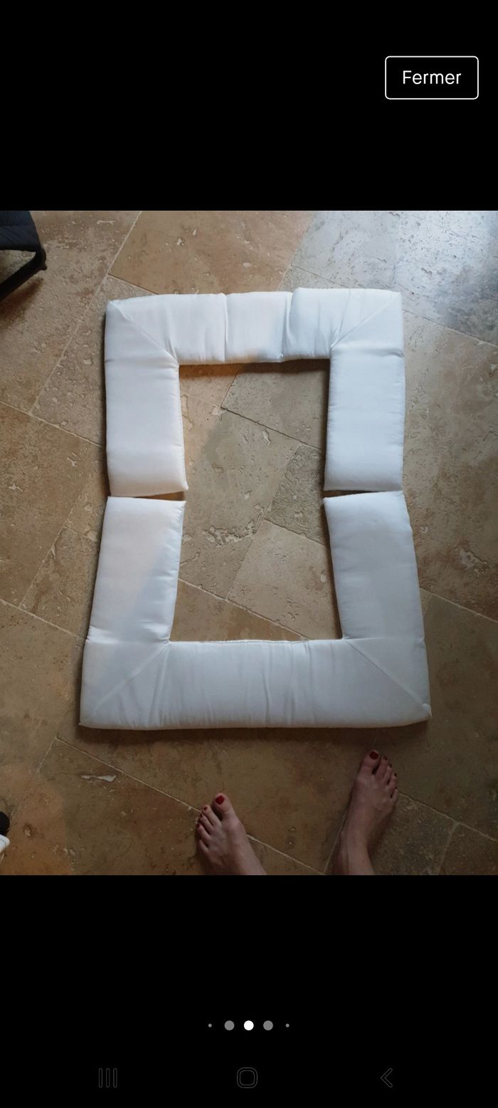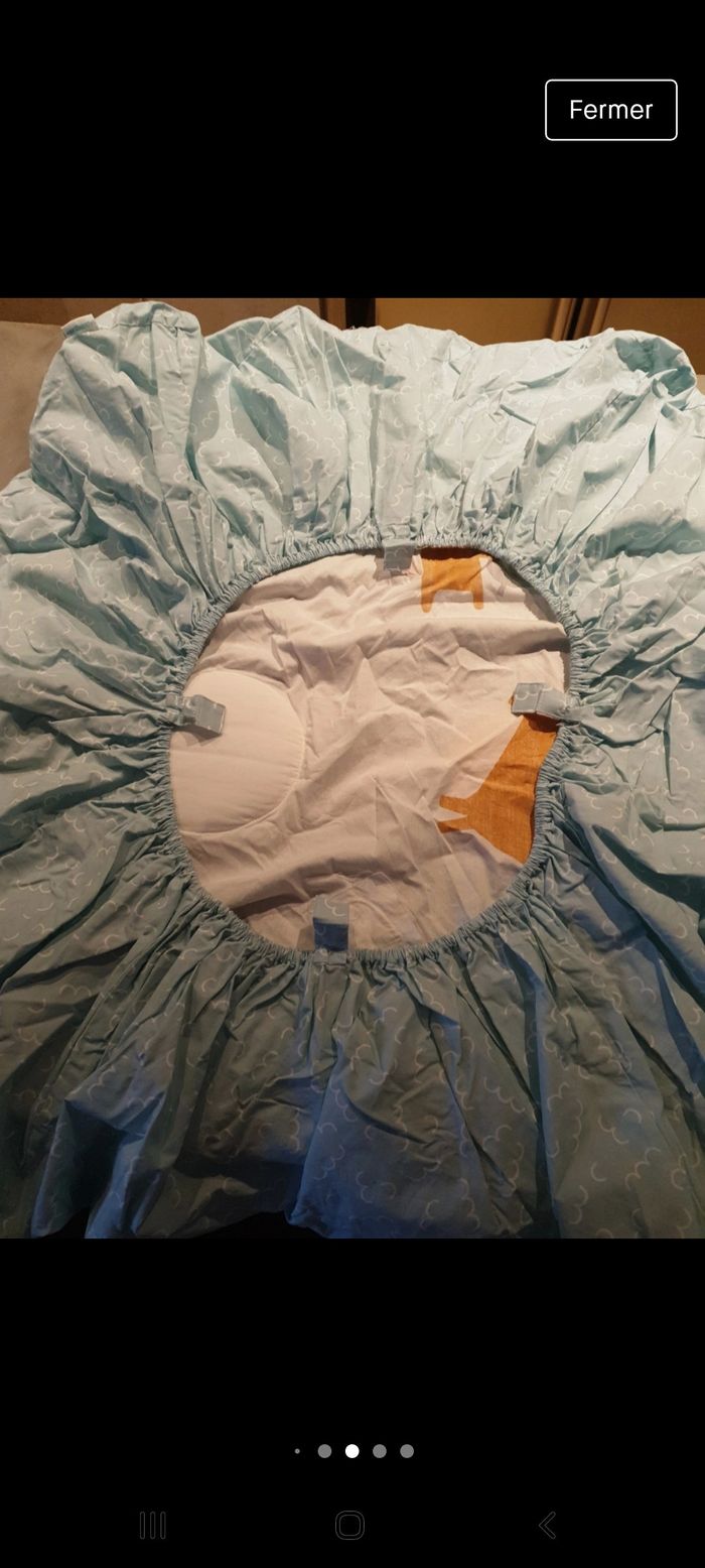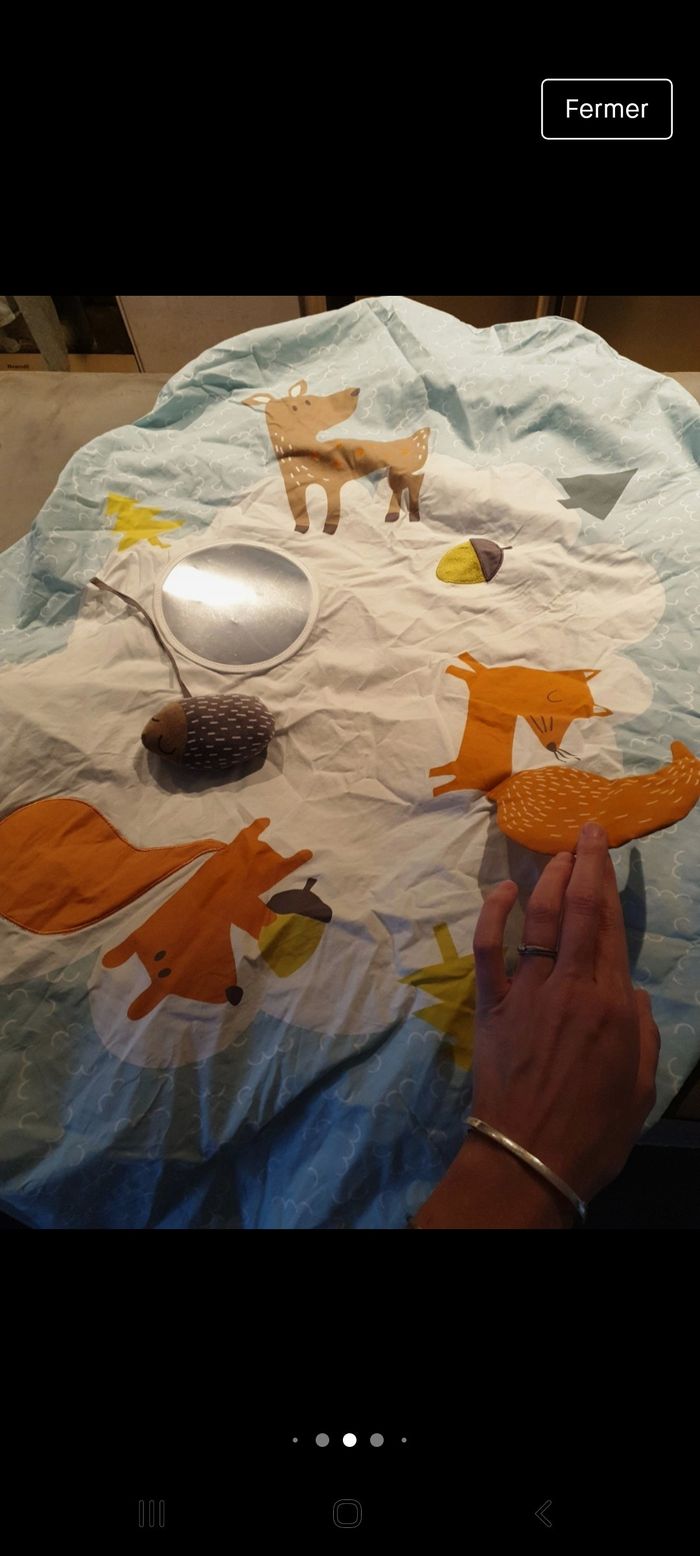 Tapis d'éveil ou de parc verbaudet Comme neuf. Les housse ont juste étaient lavés. -1 tapis simple 70x98cm épaisseur 3cm -1 autre tapis de la même grandeur et même épaisseur avec un trou au milieu. Permet de caler bebe pour éviter qu'il roule. -1 housse bleu avec des petits jouets miroir, renard qui fait du bruit -1 housse blanche simple avec des étoiles. Le tout est de la marque verbaudet acheté 60e.