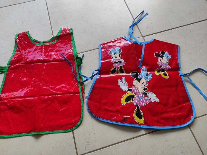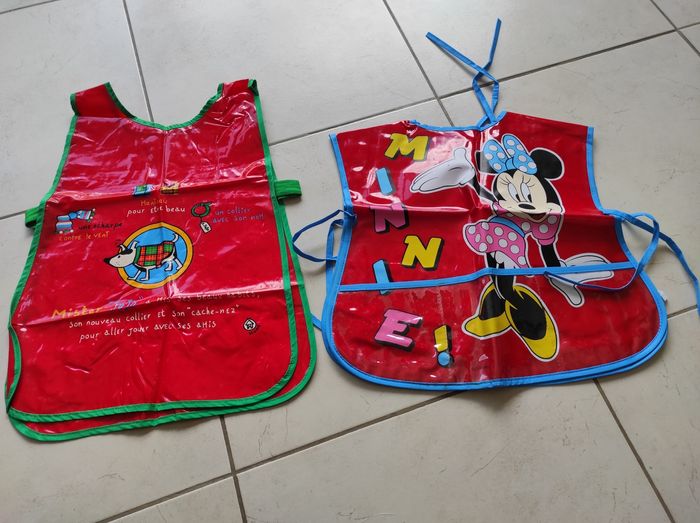 Lot de 2 tabliers peinture ou grand bavoir tous les 2 neufs dessin pas abîmé Un avec un chien devant et dos élastique sur les côté Un mini devant et dos avec cordons d'attaches