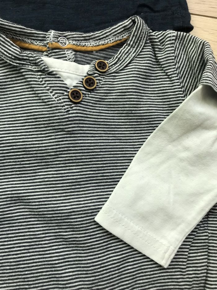 Lot de 4 tee shirts manches longues 3m Un blanc col tunisien Kiabi Un bleu marine poche rayée tape à l’œil Un Rouge bordeaux hello sans marque Et un blanc rayé marine en superposition gemo baby