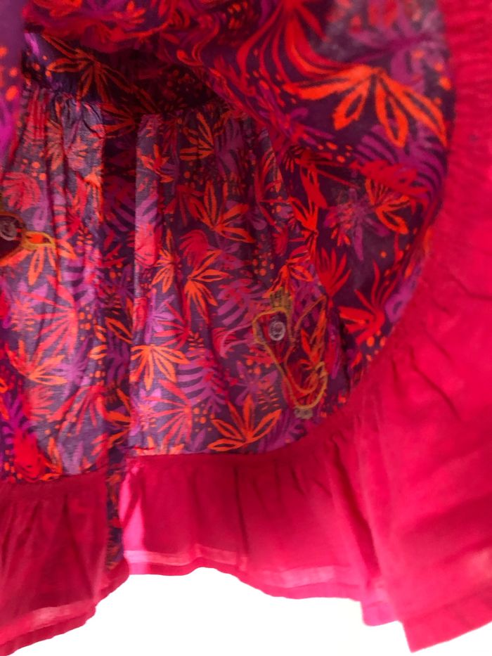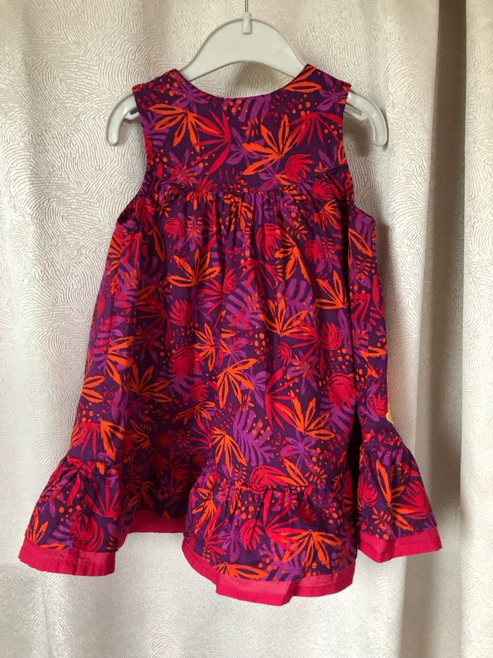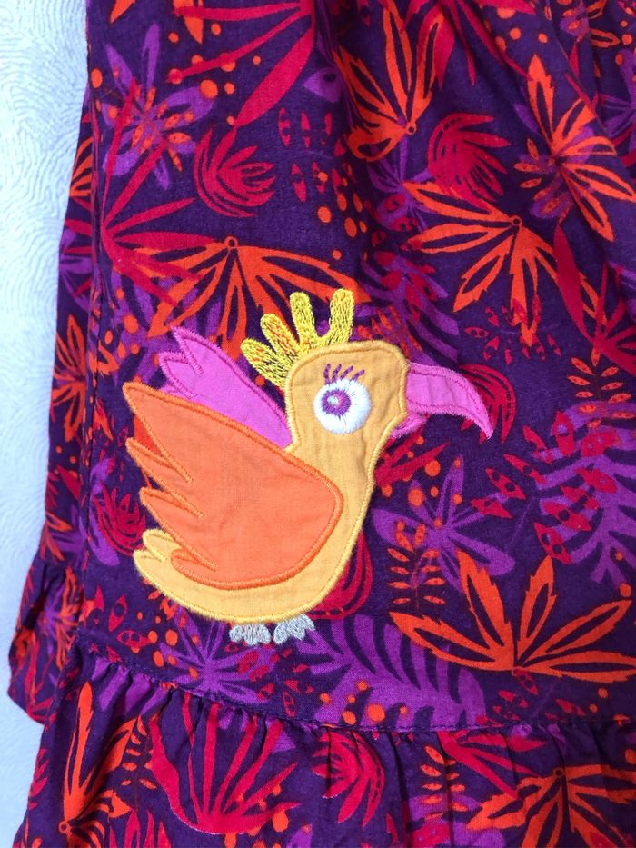 Magnifique robe bain de soleil Imprimé tropiques Tons fuchsia violet orange Brodée oiseaux S’ouvre entièrement milieu devant Taille 9 mois 71 cm DPAM