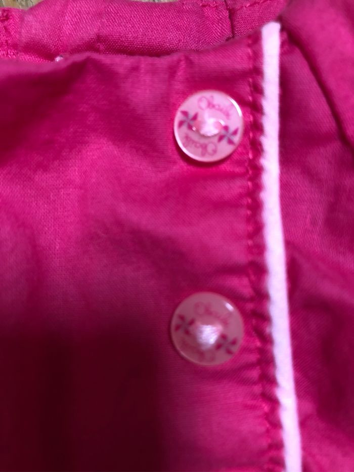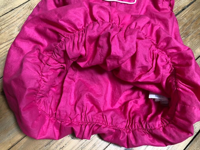 Très jolie Robe ballon rose bonbon alors qu’elle paraît rose fuchsia sur les photos, encore plus clair que la photo où il y’a la marque Boutons fantaisies Entièrement doublée Taille 6 mois 67 cm 100% coton Obaibi