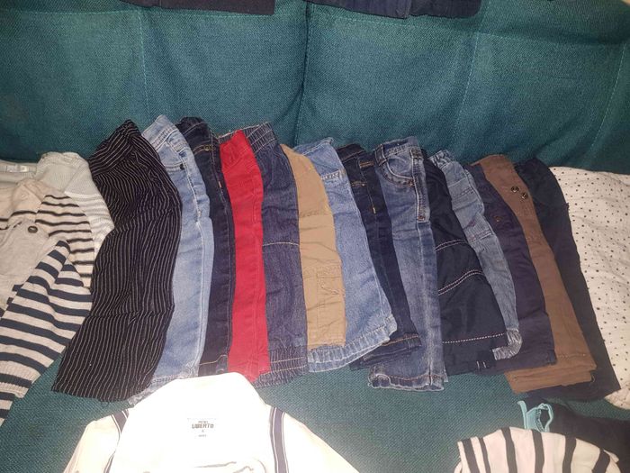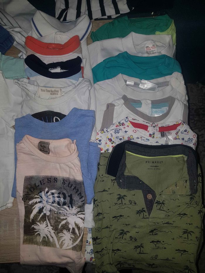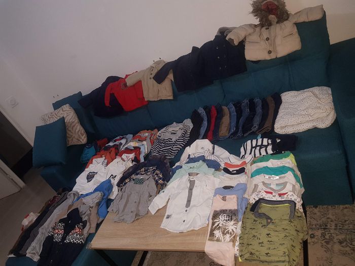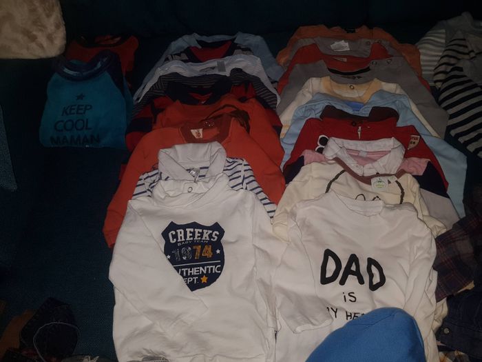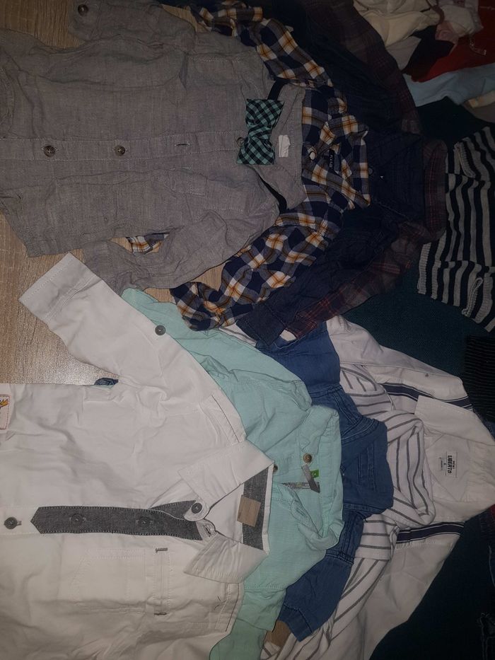 Lot composé de : 13 t-shirts manches courtes 9 chemises dont 1 manches courtes + 1 nœud papillon 4 gilets 4 salopette 2 pyjamas polaires 19 t-shirts et polo manches longues 3 pulls 14 pantalons/jeans 2 shorts 1 gigoteuse 3/6mois 1 doudoune & 1 manteau chaud 2 gilets polaires 1 veste polaire & 1 veste fourrure intérieur Tout est plutôt en bon état général